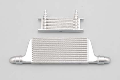 10分の1サイズ ボディのフロントマスクを引き締めるハイクオリティパーツ、インタークーラー/オイルクーラーセットです。ディテールにこだわりクーリングフィンまで細かく再現し、アルミ風のメッキでリアル感を演出します。
