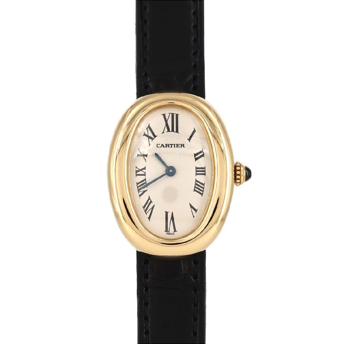 1912年に原型が誕生したカルティエのアイコン「ベニュワール」。フランス語でバスタブを意味する名の通り、官能的な曲線を描くオーバルケースが特徴です。イエローゴールド製の優美なケースに、ローマ数字とブルースティール針を配した伝統的な文字盤が映えます。クォーツ式で扱いやすく、その時を超越したデザインは、腕元から気品と自信を与えてくれるでしょう。