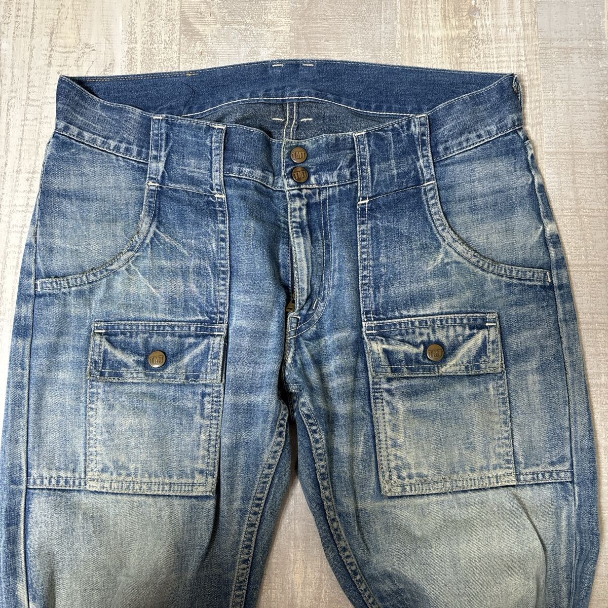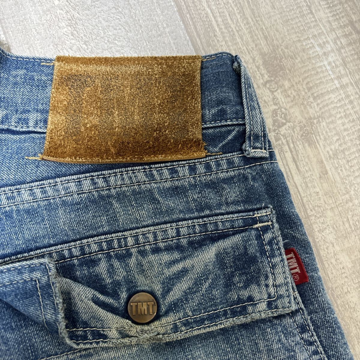【日本製】TMT ブッシュ デニム パンツ ティーエムティー サイズL メンズ ヴィンテージ ユーズド アメカジ スウェードレザーパッチ