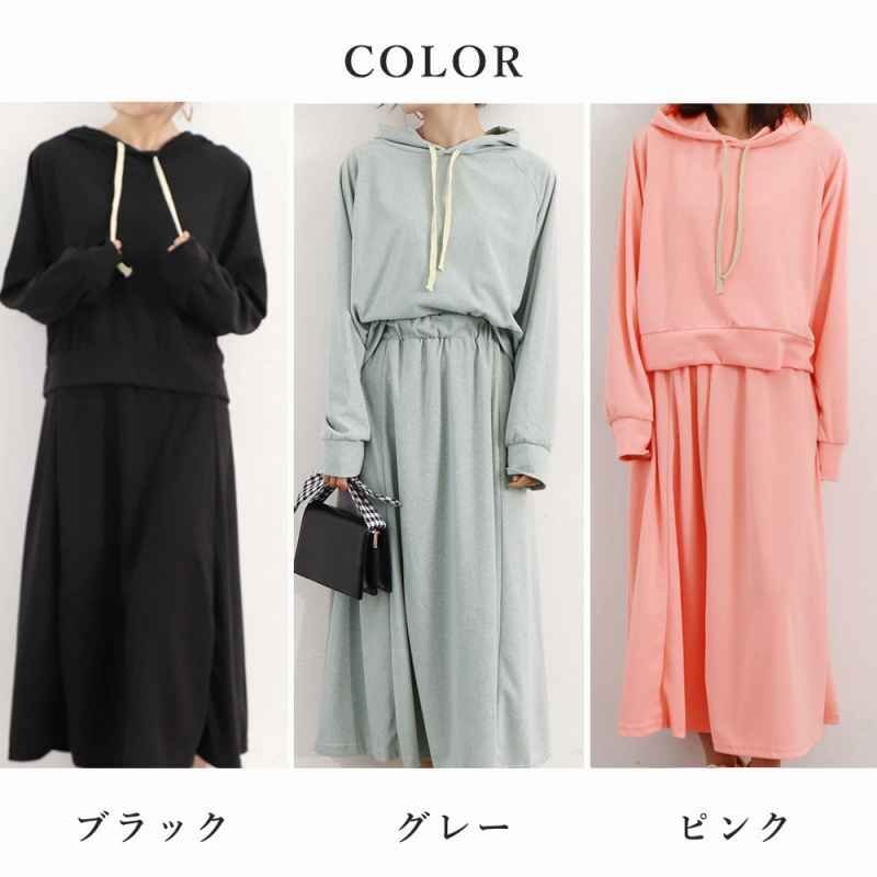 スポーティーなパーカーとロングスカートのお得な2点セットです。