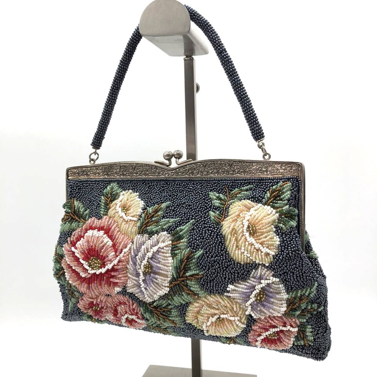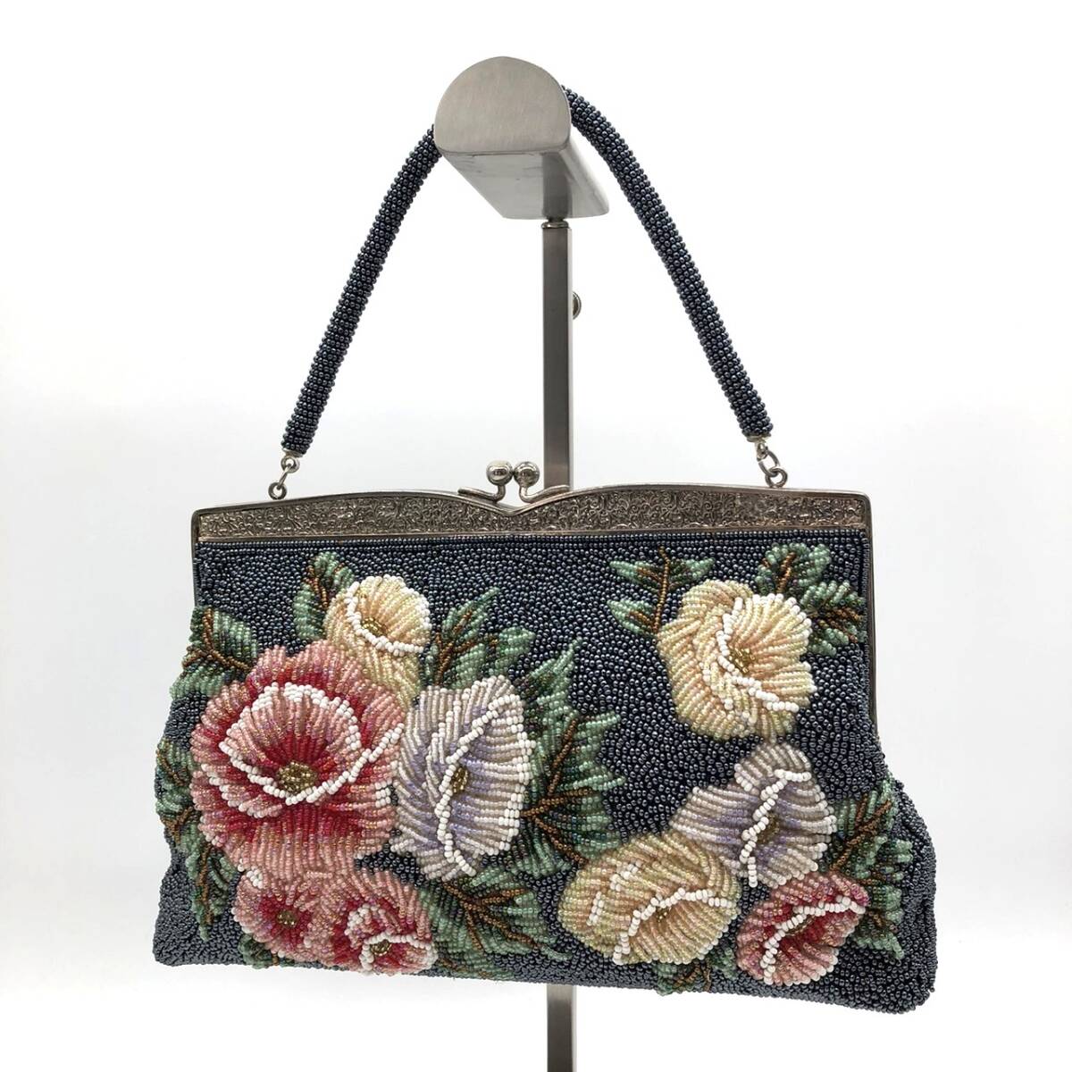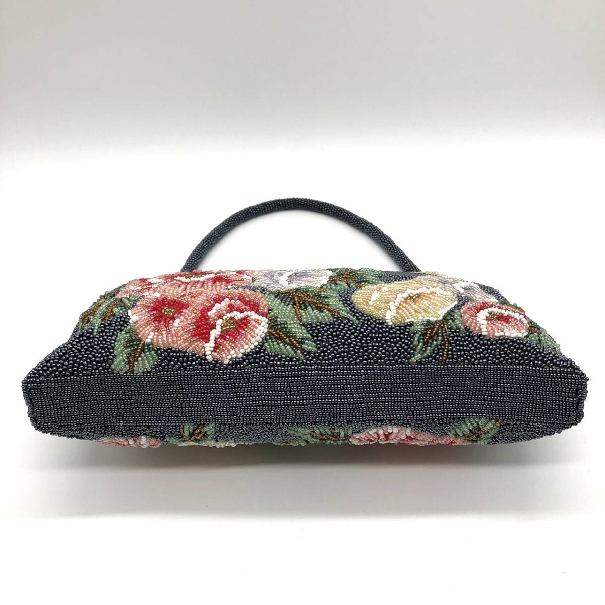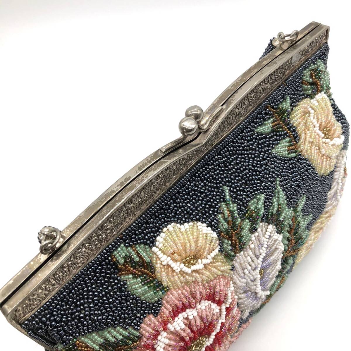 昭和レトロ ビーズバッグ がま口ハンドバッグ ヴィンテージ お茶会 パーティー 礼装 洋装 和装 ヘマタイト系花柄 |