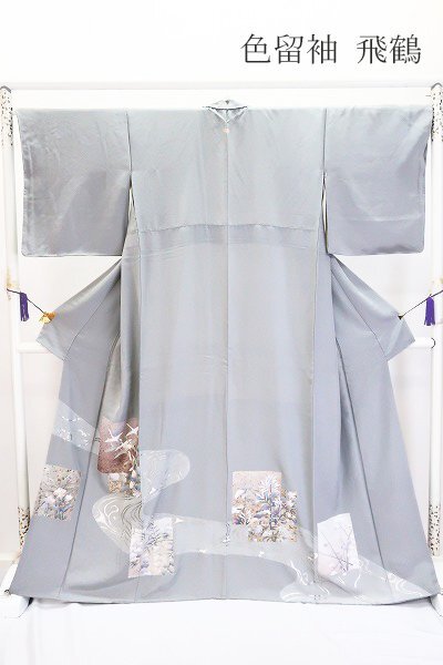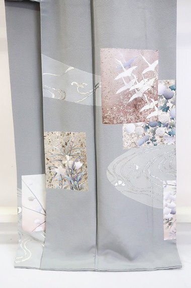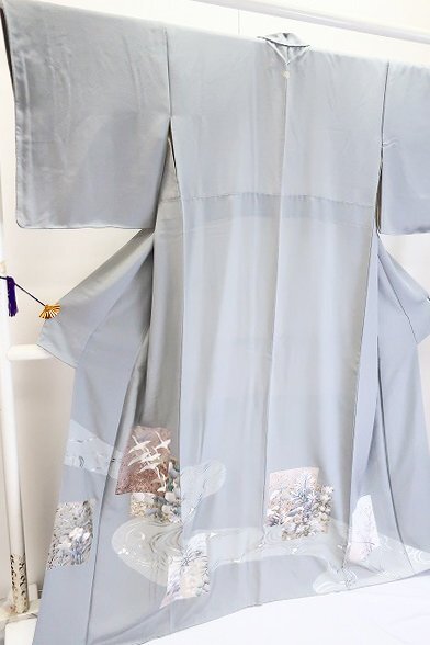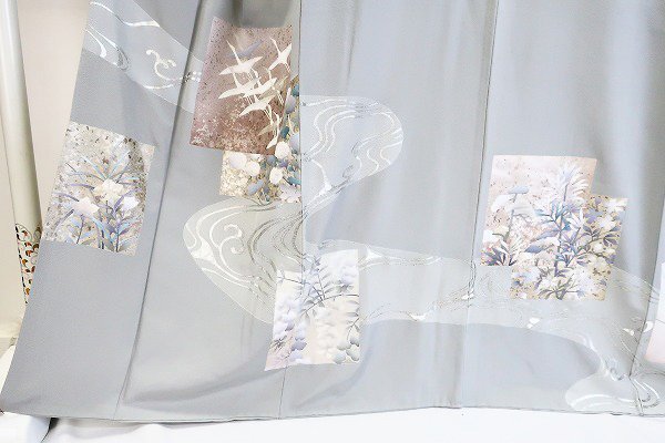 未使用品 色留袖 薄いブルーグレー 流水 飛鶴 梅 枝花 刺繍 銀彩加工 身丈164cm 仕立て上がり 正絹 着物フィ m-8340 |