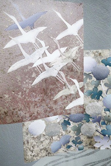 薄いブルーグレーの絹地に、流水に飛鶴、梅や桔梗などの枝花が描かれた色留袖です。 銀彩加工が輝き、柄の一部に施された刺繍が美しい一枚です。 未使用品です。 ※染め抜き一つ紋入りです。 担当 伊藤 |