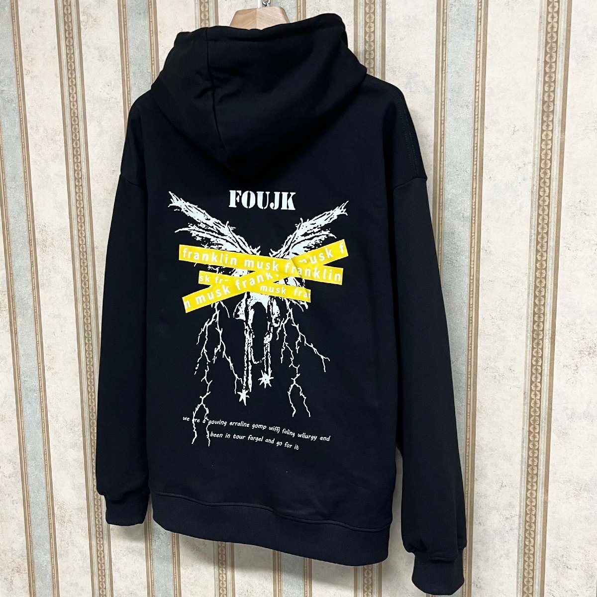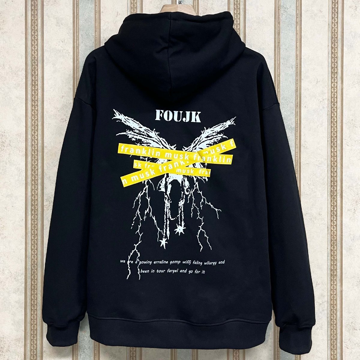 フロントはシンプルな無地デザインで、バックにはインパクト抜群のプリントを大胆に施し、ストリートスタイルに強烈な個性をプラスしています。さりげなく着こなせるのに、後ろ姿でしっかりと存在感を放つ一枚です。