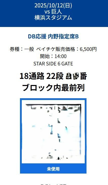 10月12日 クライマックスシリーズ第二戦 横浜スタジアム DB応援内野指定席B最前列 デジタルチケット2枚