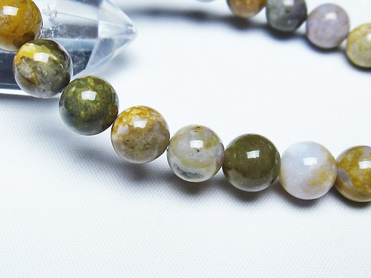 ■商品名: オーシャンジャスパー ブレスレット ■商品ID: T153-3024 ■商品重量:約 21.9g ■商品サイズ:内周約:164mm(±5mm)粒直径約:9mm(±0.5mm) 【ジャスパー(碧玉)】 ジャスパーは石英の結晶に様々な不純物が混じり結合した鉱物で、アゲートやカルセドニーと同じ仲間です。 構成が似ているため分類が難しいのですが、基本的に不純物の割合が多く不透明のものがジャスパーとされています。 抽象画のような味わい深い模様を持つものや鮮やかな色合いを持つものなど多彩な表情を持ち、個性を楽しめる石のひとつだといえるでしょう。 ジャスパーは日本にも縁が深く弥生時代から管玉や勾玉に加工され古くから装飾品として愛用されてきました。 なかでも島根県の玉造温泉は玉造石を使った勾玉の名産地だったといわれており、この土地で産出されたジャスパーは玉造石のひとつとして「出雲石」という別名でも親しまれています。 このほかにも青森県で産出される「綿石」もジャスパーを含んだ美石として知られています。 ジャスパーは正しい判断力と決断力をもたらすとされ、心身の疲労やストレスを癒すヒーリング効果も期待されます。 バランスをとる能力に長けた石ですので、仕事や人間関係でうまく立ち回りたい方や、生活に安定や平穏を望む方に特におすすめです。 ⇒ ジャスパーをもっと詳しく ◆ワンポイント情報 ジャスパーは不純物の成分によって色合いが大きく異なります。ヘマタイトを含有したものは赤色、クローライトを含有したものは緑色、クレイ粘土などの不純物が含有した黄色など、多彩な色合いのジャスパーが存在します。 |