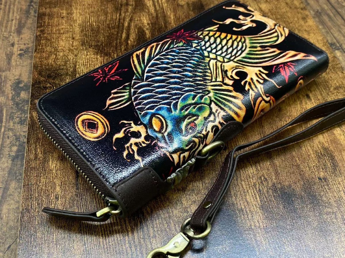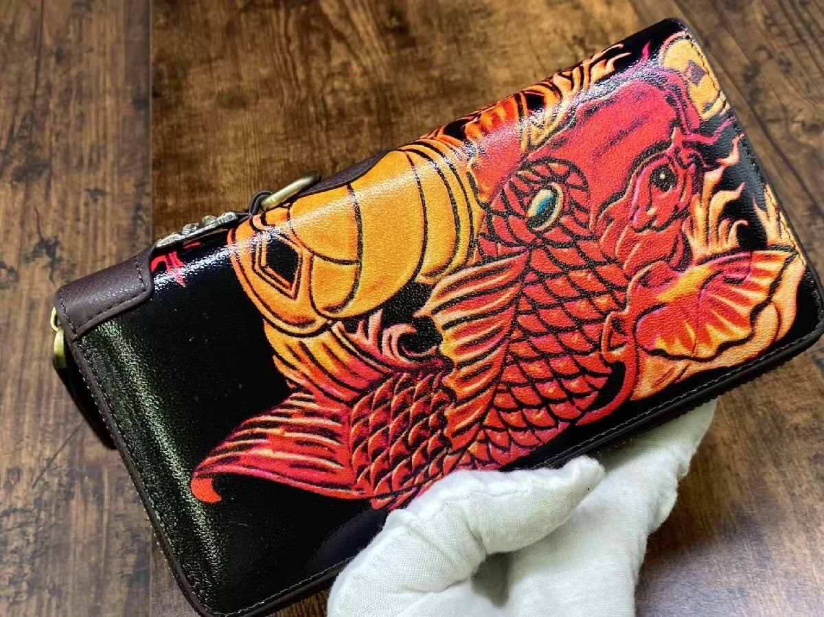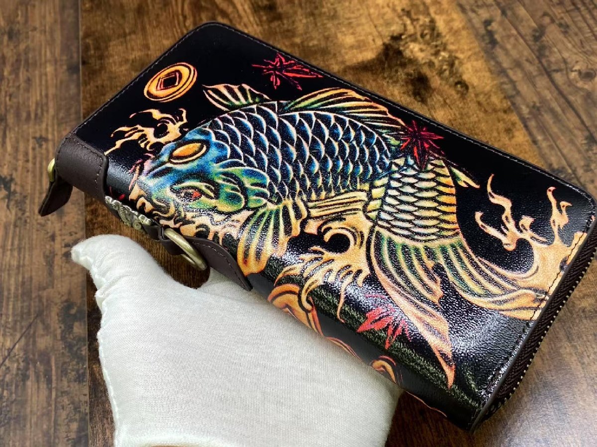 1円 新品 錦鯉 本革 長財布 牛革 ウォレット 牛ヌメ革 ラウンドファスナー 男性用財布 未使用