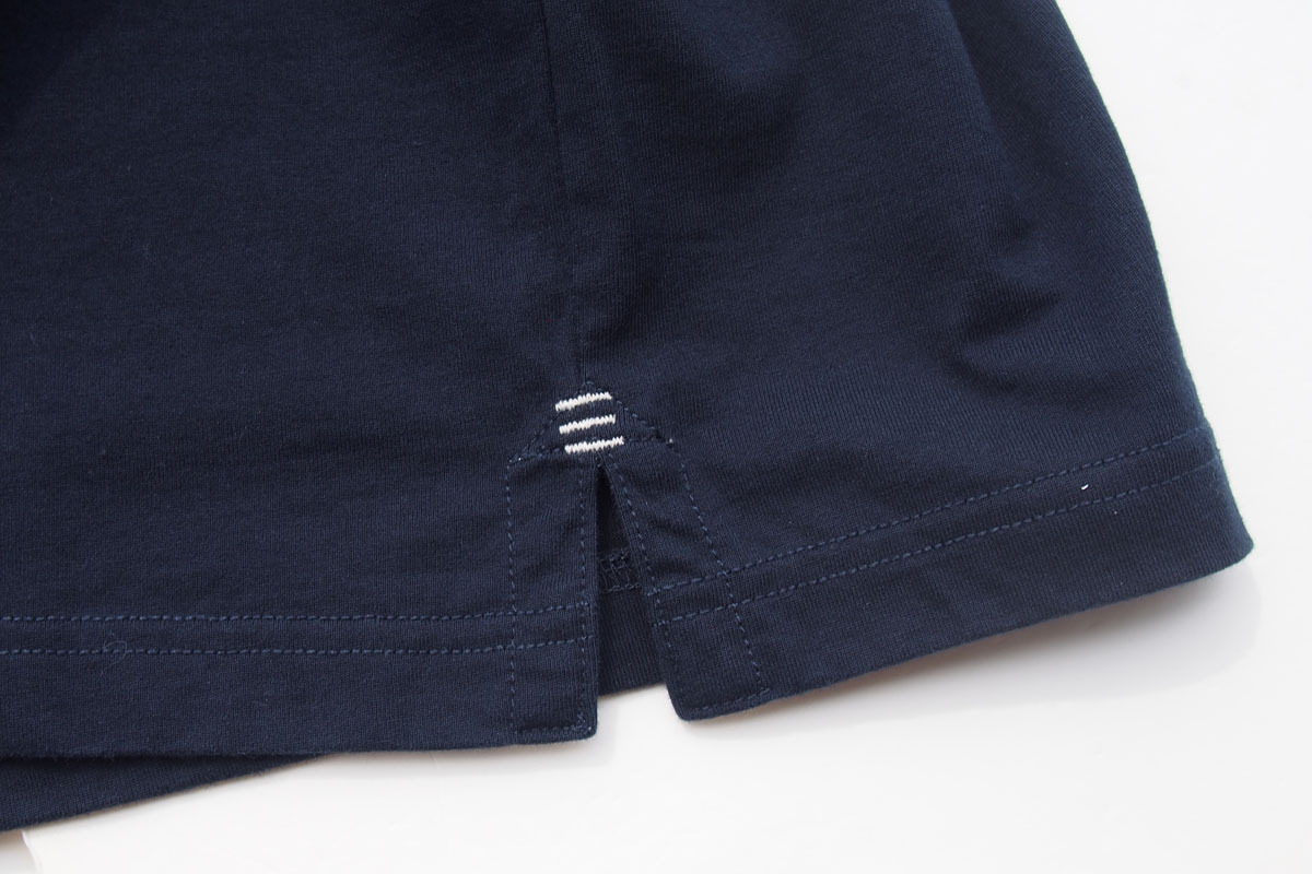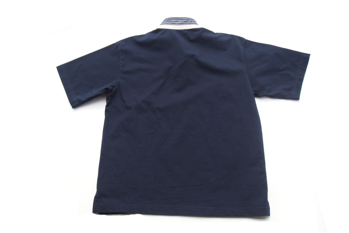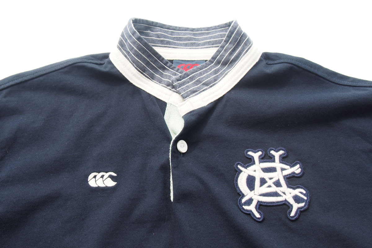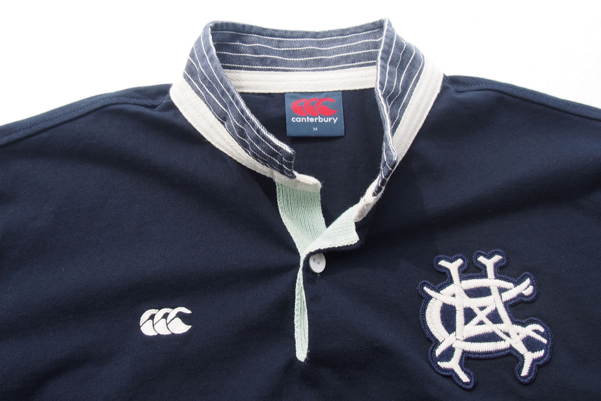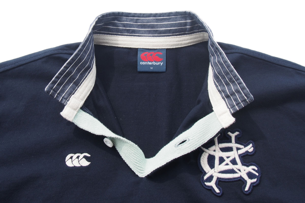 <カンタベリー>の半袖ラガーシャツは、ネイビーを基調にストライプ入りの襟を組み合わせた、クラシックかつ力強いデザインが魅力です。