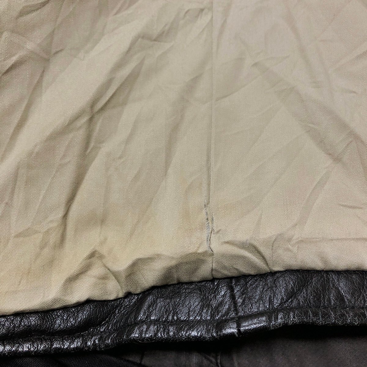 中古品です。使用感があります。ボディの所々に経年による擦れや傷、裏地首周りや裾等に薄汚れ、裏地裾に小さな破れ、ポケット内にリペア跡があります。