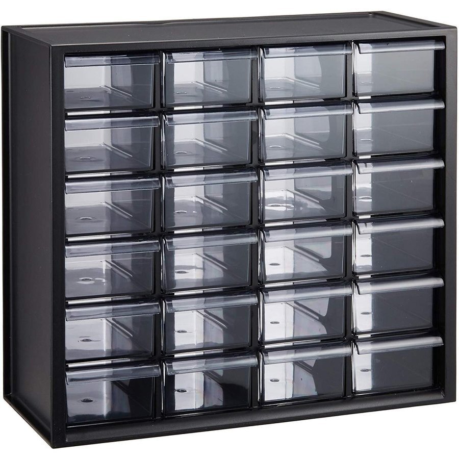 商品説明 | 小物収納に便利な引き出し24個付きのキャビネットです 引出しが飛び出しにくい、簡易ロック構造です ●商品サイズ(cm):幅30.8×奥行13×高さ28.7 ●引き出し内寸幅約6.2×奥行約10.6×高さ約3.9 ●カラー:ブラック ●主要材質:ハイインパクトスチロール・スチロール ●収納の目安:小物、パーツ等 |