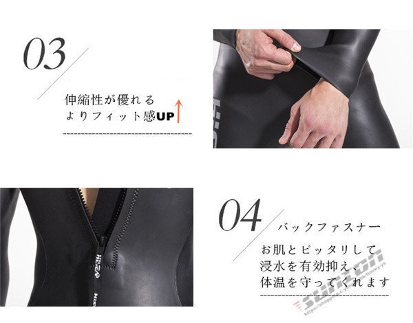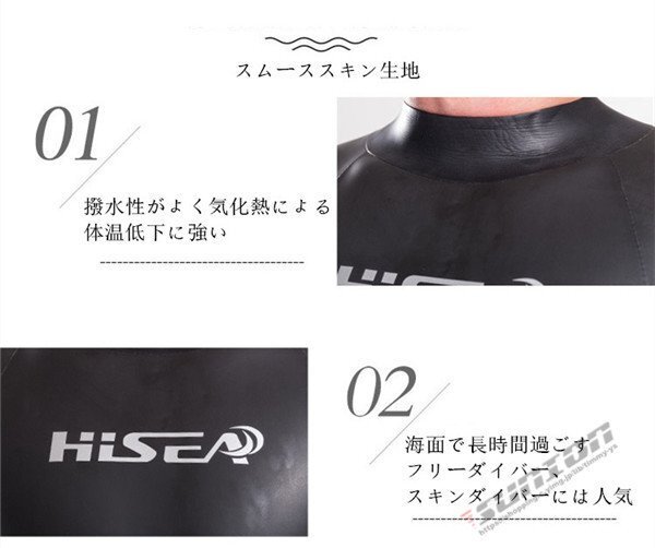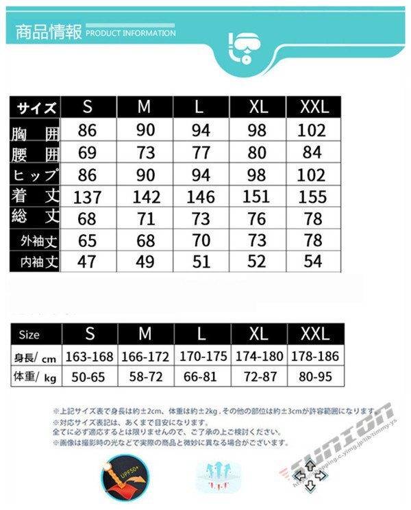 『商品特徴』: 【防寒性】ストレッチネオプレーンを採用しており、保温性、速乾性に優れて、 水中に入って、お肌とピッタリしているカッティングで浸水を有効抑え、     体温を守ってくれて、オールシーズンで適用できる。 【着心地良い】人間工学に基づいて設計され、3D裁断より人体とピッタリ合う、余すどこもなくフィットUP! 筋肉を引き締め、運動性をアップ!ストレッチ素材のため、着脱しやすい。 【耐久性抜群】強度を高めたフラットシーマー縫製を採用、縫製部の強度と耐久性ともに優れ, 内部で糸を折り返すため縫い目からの浸水を抑えることができ、 また縫い目も平に仕上がることにより、肌触りが快適。 【紫外線や怪我防止】UVカット保護指数はUPF50+より紫外線遮断率は99%以上可能。 ビーチや海底に多くの鋭い石や海の生き物による刺し傷やスレ傷、切れ傷などを防ぐ 。 【用 途】サーフィン、シュノーケリング、ダイビング、水泳、ビーチバレボール、様々なマリンスポーツに適します。