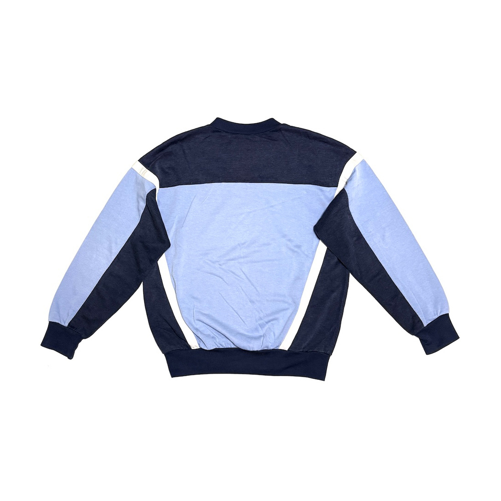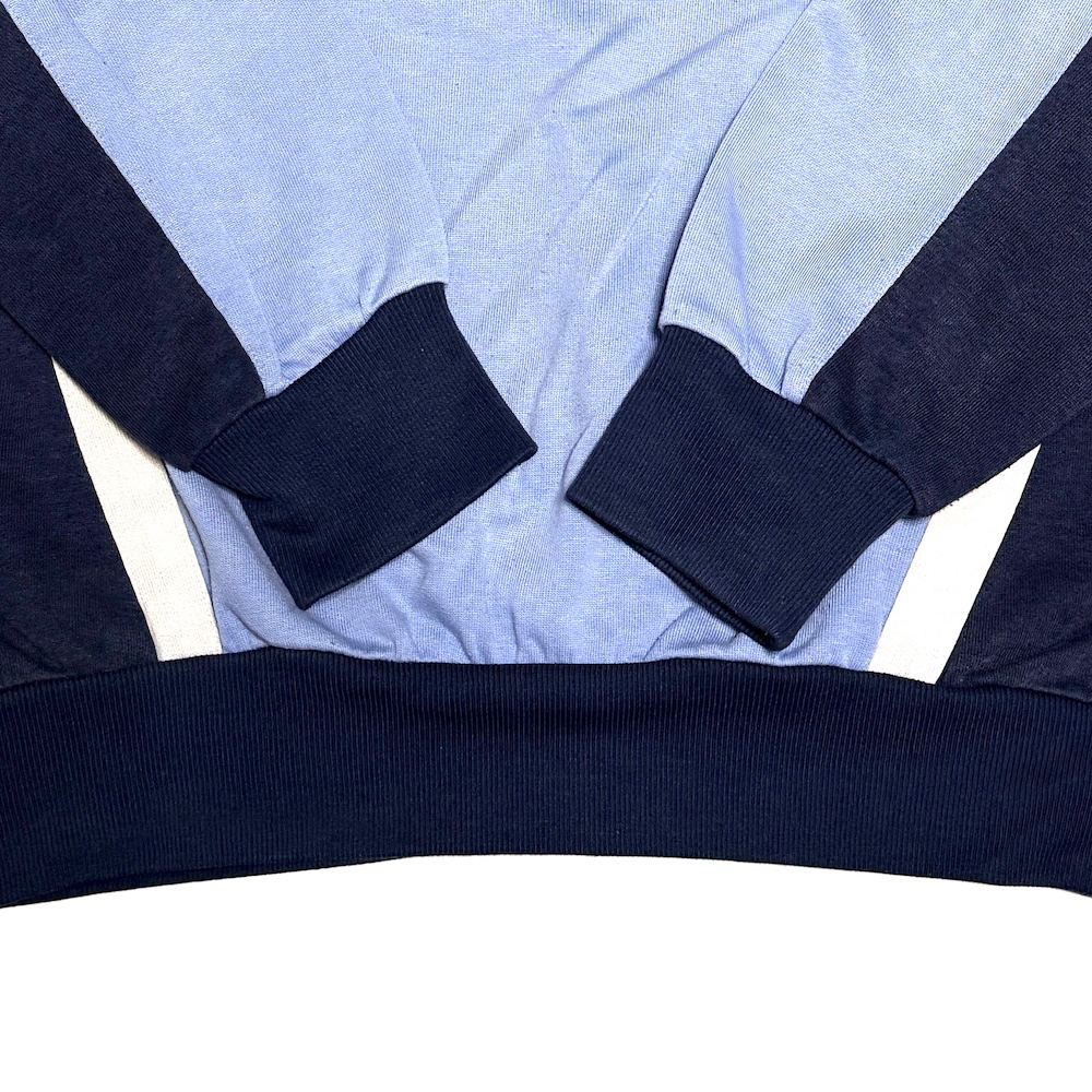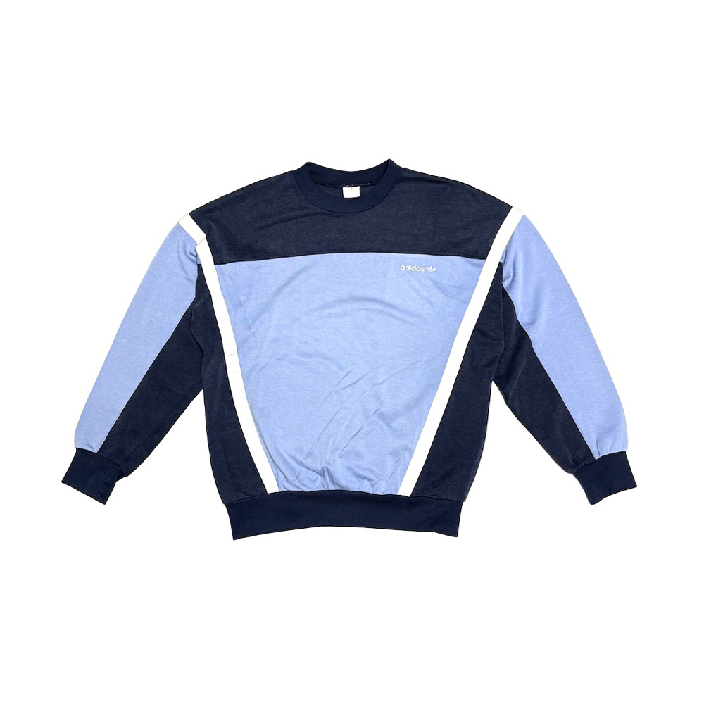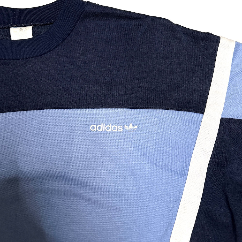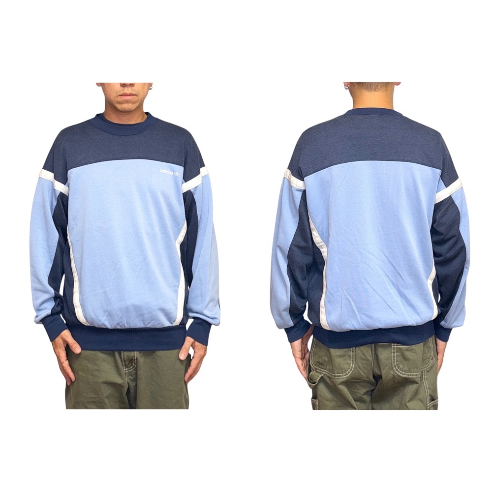 USEDの80's adidas アディダス トリカラーパネル スウェットです。80年代adidasのパネル切り替えデザインが映える、珍しいハンガリー製スウェット。ネイビー×サックスブルーにホワイトのラインテープを組み合わせた当時らしい、スポーティでユーロ圏ならではの配色が魅力。胸にはフロッキープリントのトレフォイルロゴ。立体的なパネル構成は80's adidas特有で、ただの無地スウェットとは一線を画す存在感があります。素材はコットンポリでこれも80's特有のやわらかく軽いボディ、着心地もデイリーに最適。袖・裾のリブも目詰まりがよく、シルエットをすっきり見せてくれます。ブランドファンには堪らないコレクタブルな1着ですが、オールドなユーロストリートスタイルが気になる方にも是非。