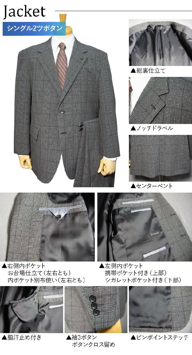| ジャケット | シングル2ボタン ノッチドラペル 総裏 センターベント 袖3ボタン ボタンクロス留め ピンポイントステッチ 汗止め付き お台場仕立て 携帯ポケット シガレットポケット |