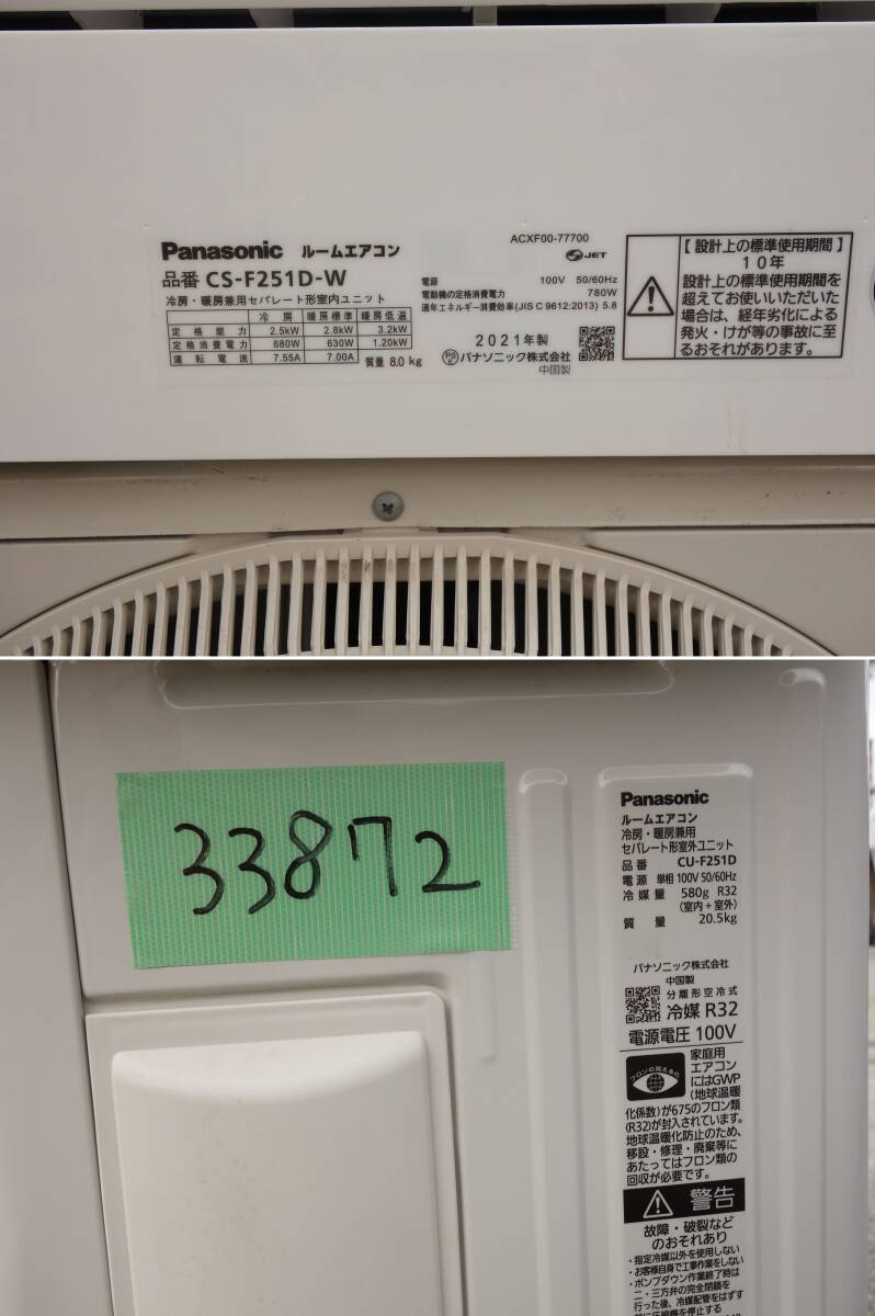 【中古】K▼パナソニック ルームエアコン 2021年 2.5kw ~10畳 Eolia エオリア 標準モデル コンパクトタイプ CS-F251D (33872)