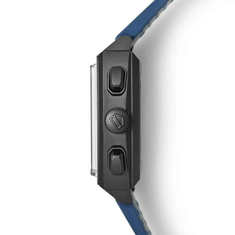 今回のモデルは文字盤やストラップにはダークブルーを使用しチタンのケースにDLCコーティングを施す事で、通常モデルよりもダークな雰囲気を演出。