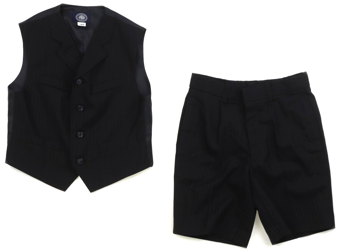 ウールモヘア素材のベストとショートパンツのセット。ベスト:後身頃はポリエステル素材。胸ポケットはフェイクです。ショートパンツ:サイズ調整ゴムが付いています。裏地なし。目立つ汚れはありません。