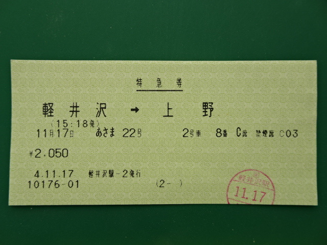 JR東日本120mmマルス券「あさま22号」特急券(軽井沢→上野)