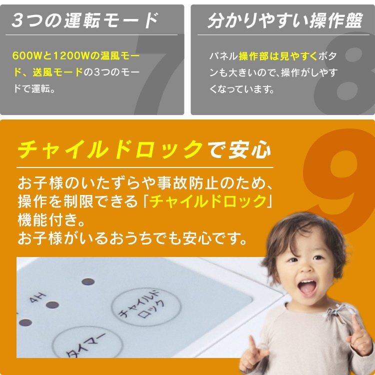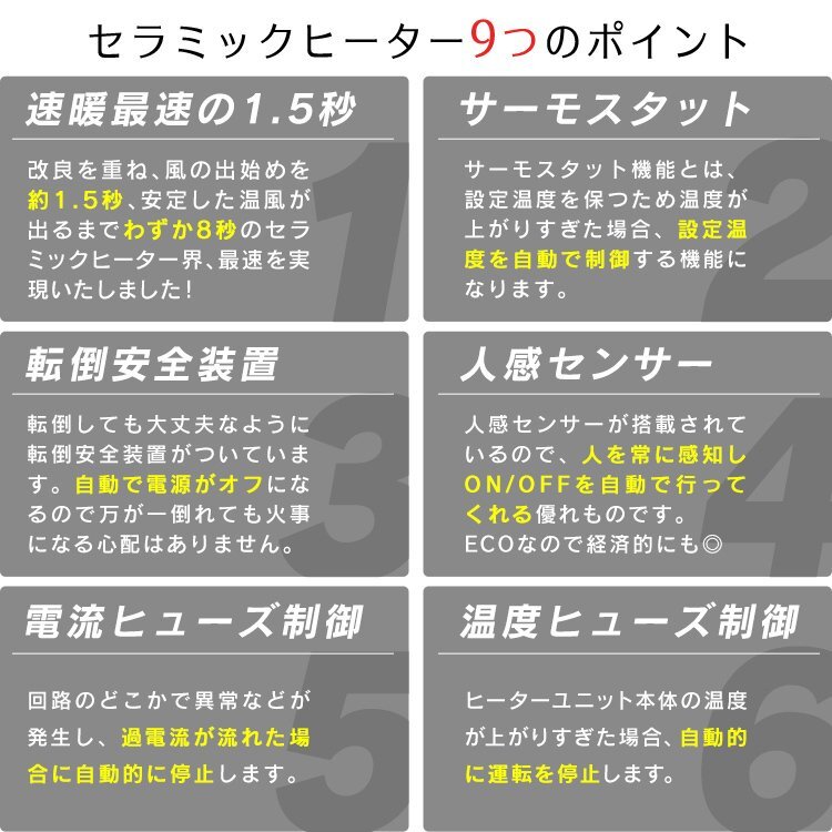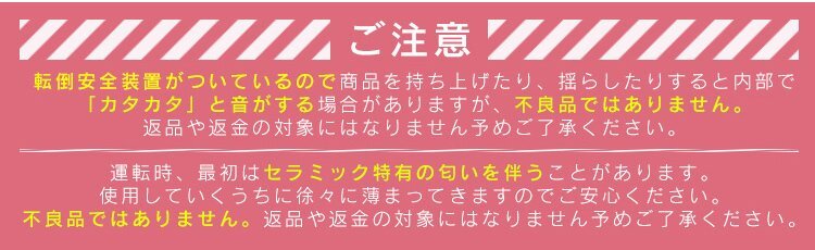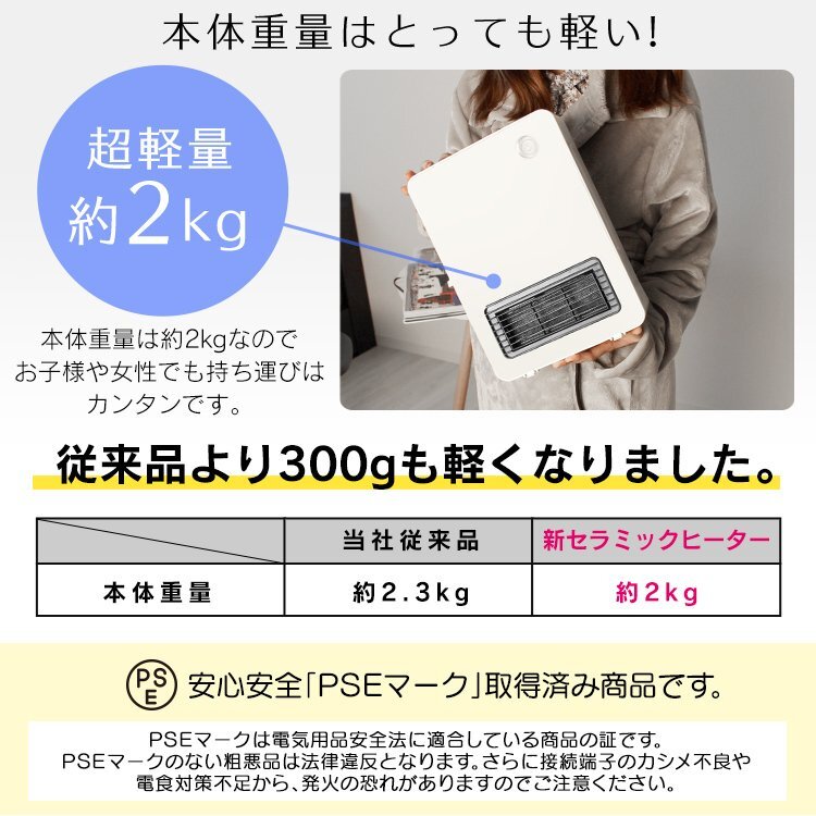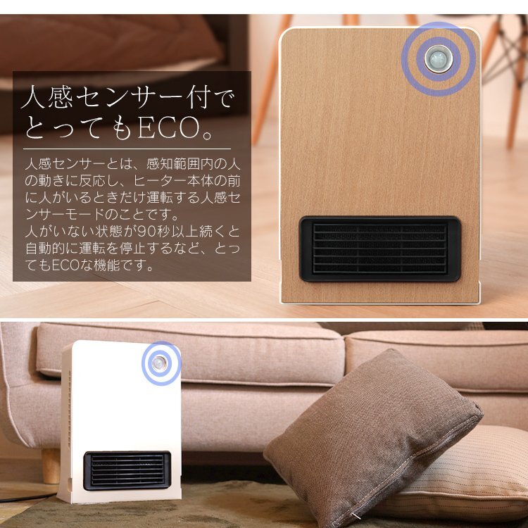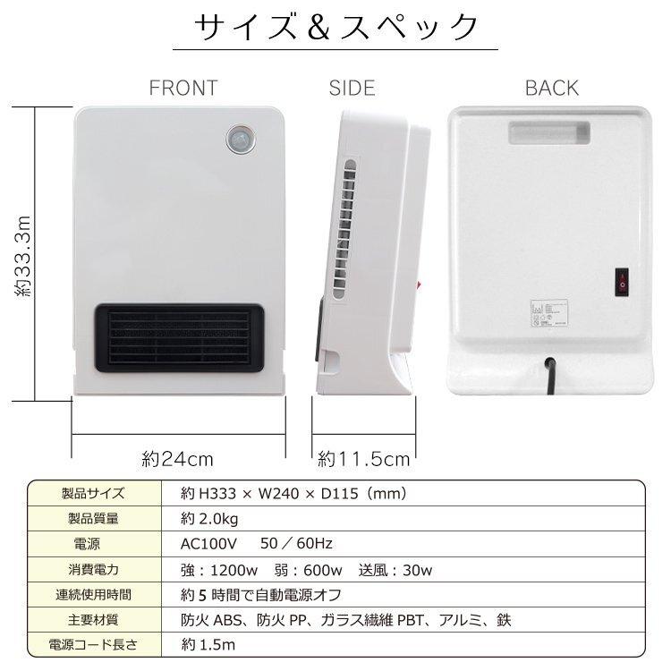 人の動きを感知して自動でON/OFFする人感センサー付きセラミックヒーターです。 人の動きを感知して自動運転するので、節電に効果的です。 電気式ヒーターなので、電源が入ると、すぐに温風がでます。 コンパクトサイズでスペースを取らないので、トイレや洗面所やキッチンなど狭い場所に最適です。 温風2段階切替で1200W・600Wの切り替えができます。 使用目的に応じて、人感センサー自動運転と常時運転の切り替えができます。 約2kgの超軽量! 女性や子供でも持ち運びラクラクです♪ 【商品仕様】 ・カラー:ホワイト(フラットタイプ) ※本体前面以外は白色となります ・サイズ:(約)幅240×奥行115×高さ330mm ・重量:(約)2kg ・消費電力:(強)1200W / (弱)600W ・電源:AC100V 50/60Hz ・コード長:(約)1.5m ・センサー感知範囲:上下90°、左右90°(センサー感知距離 約3m) ・素材:耐熱ABS、アルミ 他 ★ウェーブ(波型)タイプはこちら↓★ 【ウェーブタイプ NBC004】 【注意事項】 ※お風呂場等の水気のある場所や不安定な場所でのご使用はおやめください。 ※長時間運転の場合は、長時間同じ向きのままパネルに熱を持つと溶けてしまう 恐れがございますので長時間ご使用される場合はルーバーの風向きがパネルに 長時間ご使用される場合はルーバーの風向きがパネルに当たり続けない角度など お客様元にてご調節をお願い致します。 ※燃えやすいもの、電化製品の近くには設置しないでください。事故の原因になります。 ※海外でのご使用は出来ません。 |