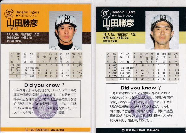 ●1993,94BBM 【山田 勝彦】 通常版2種 No.337,101:阪神