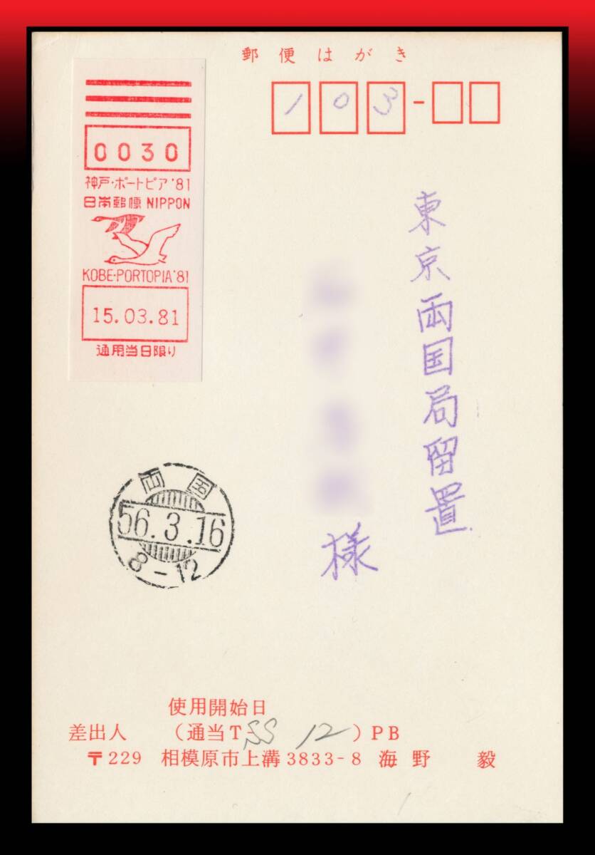 ●メータースタンプ/期間限定特設局|留置私製葉書 MS:0030/神戸・ポートピア’81/15.03.81 留置印有り エンタイア