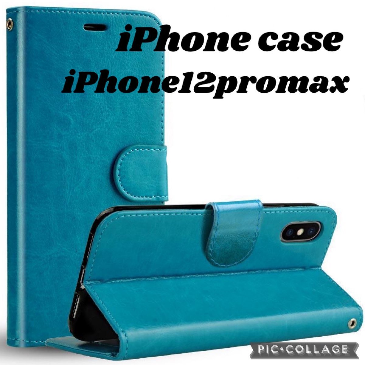【iPhone12ProMax:ターコイズブルー】iPhone ケース 手帳型 液晶強化ガラスフィルム 2点 セット 保護フィルム 手帳 カード スマホ A58