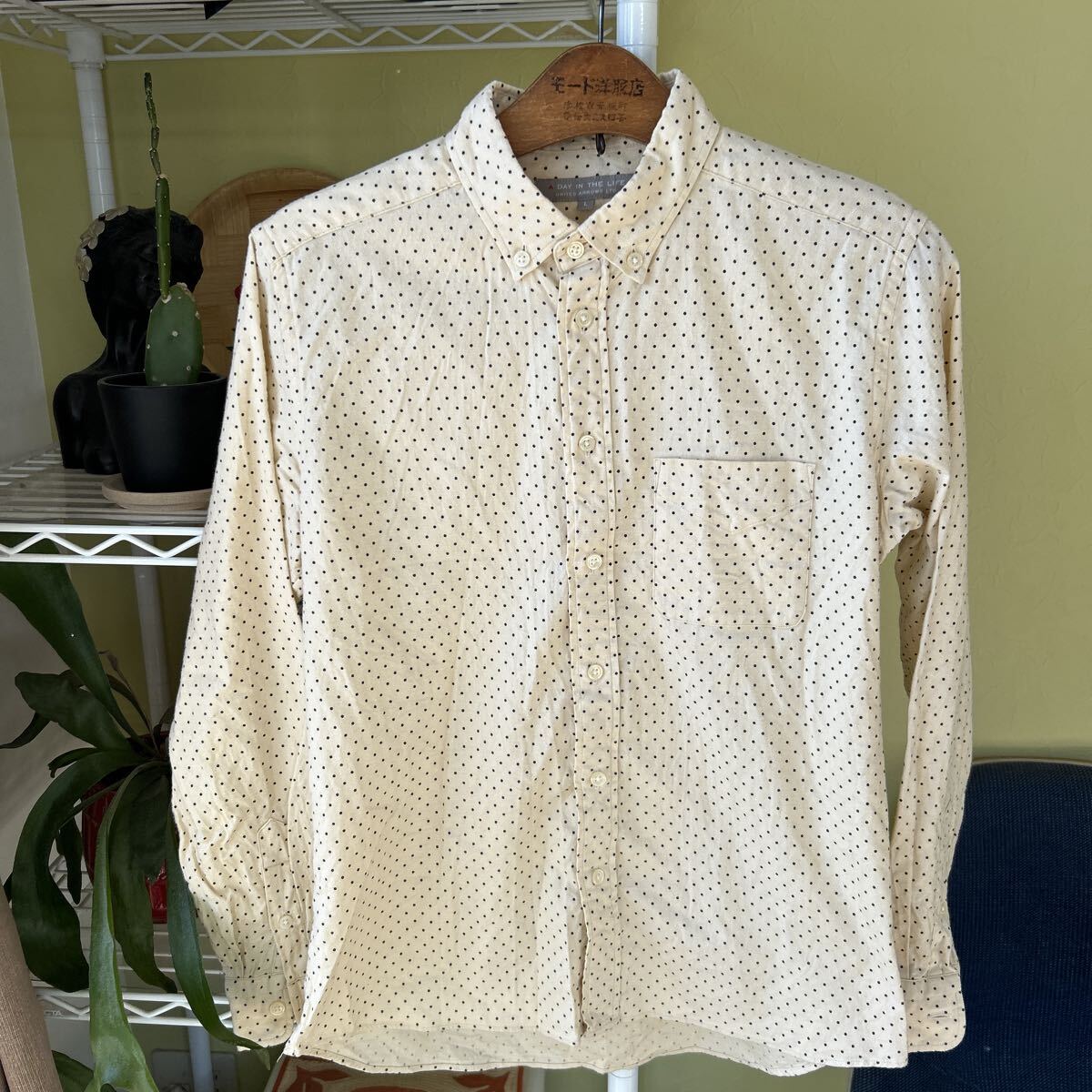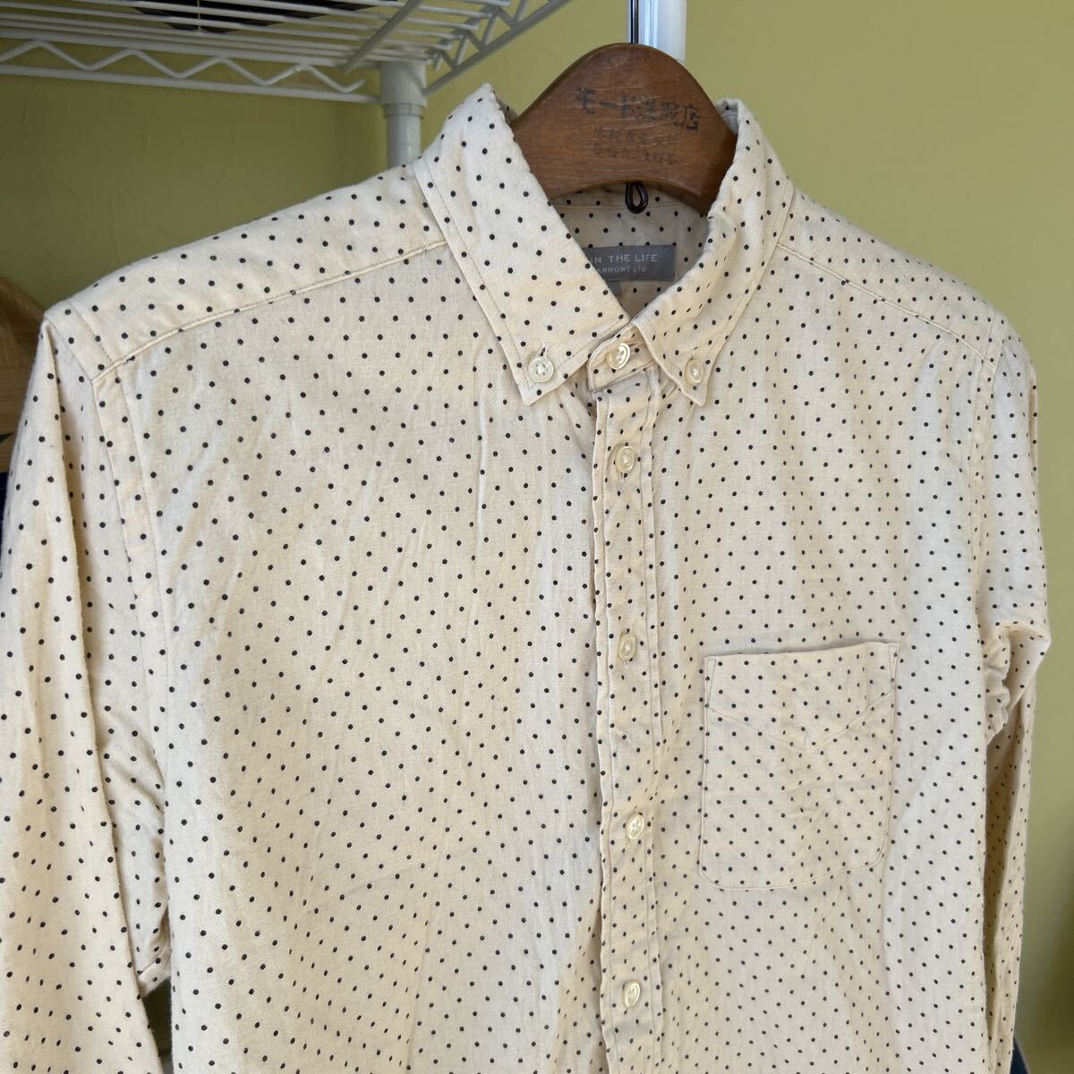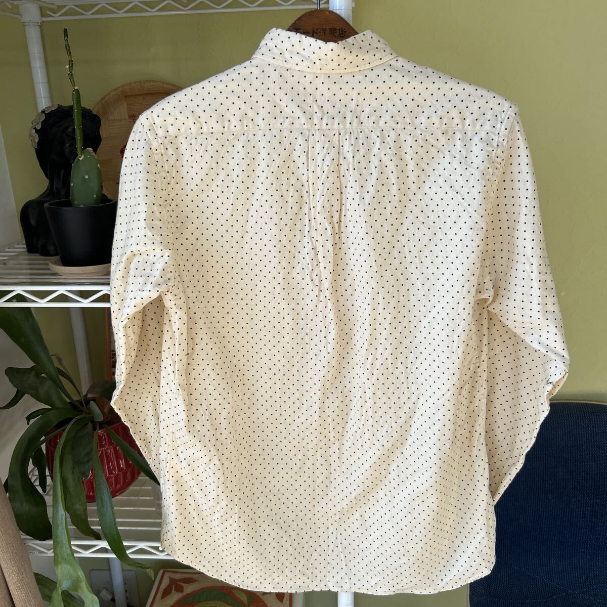 袖丈52(脇下縫目〜袖先端)多少の誤差はお許しください。良い雰囲気です。日本製 綿100 軽いネルシャツ アイボリー ドット ボタンダウン できる限りダメージは説明させていただきますが、こちらが気づかない程度のわずかなしみ、よごれ、