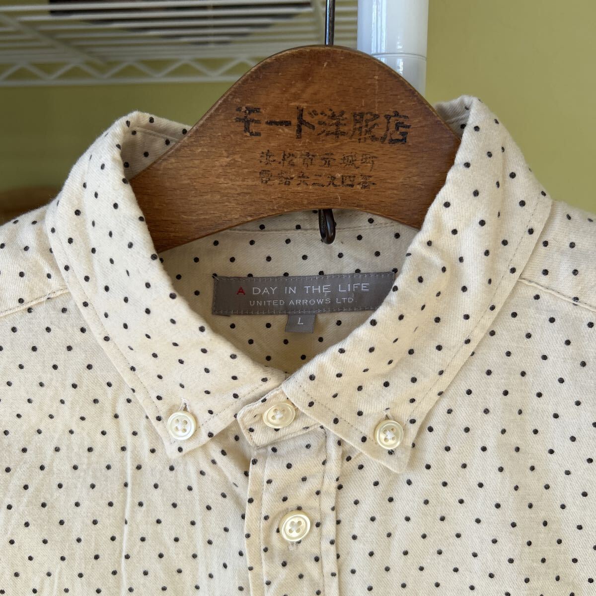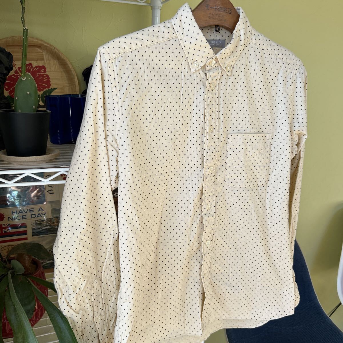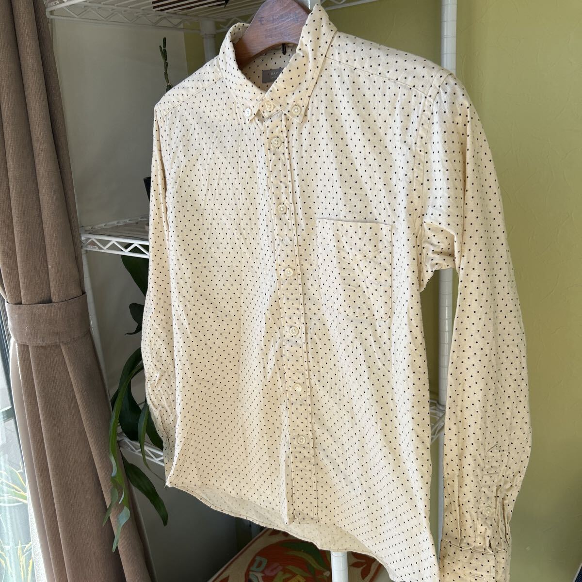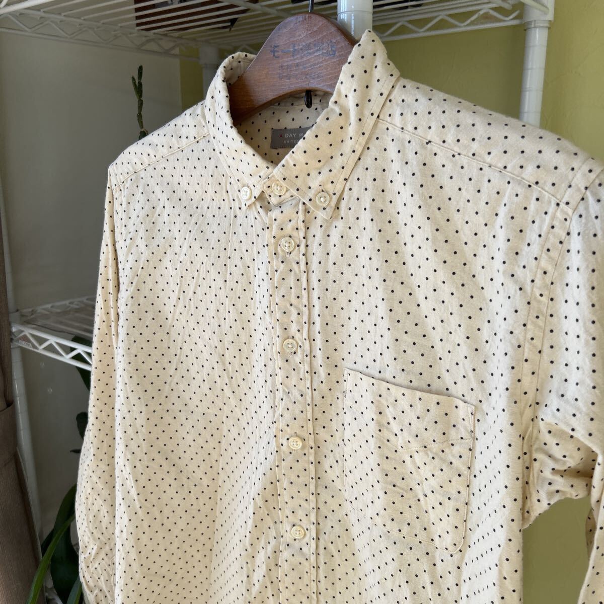 袖丈52(脇下縫目〜袖先端)多少の誤差はお許しください。良い雰囲気です。日本製 綿100 軽いネルシャツ アイボリー ドット ボタンダウン できる限りダメージは説明させていただきますが、こちらが気づかない程度のわずかなしみ、よごれ、