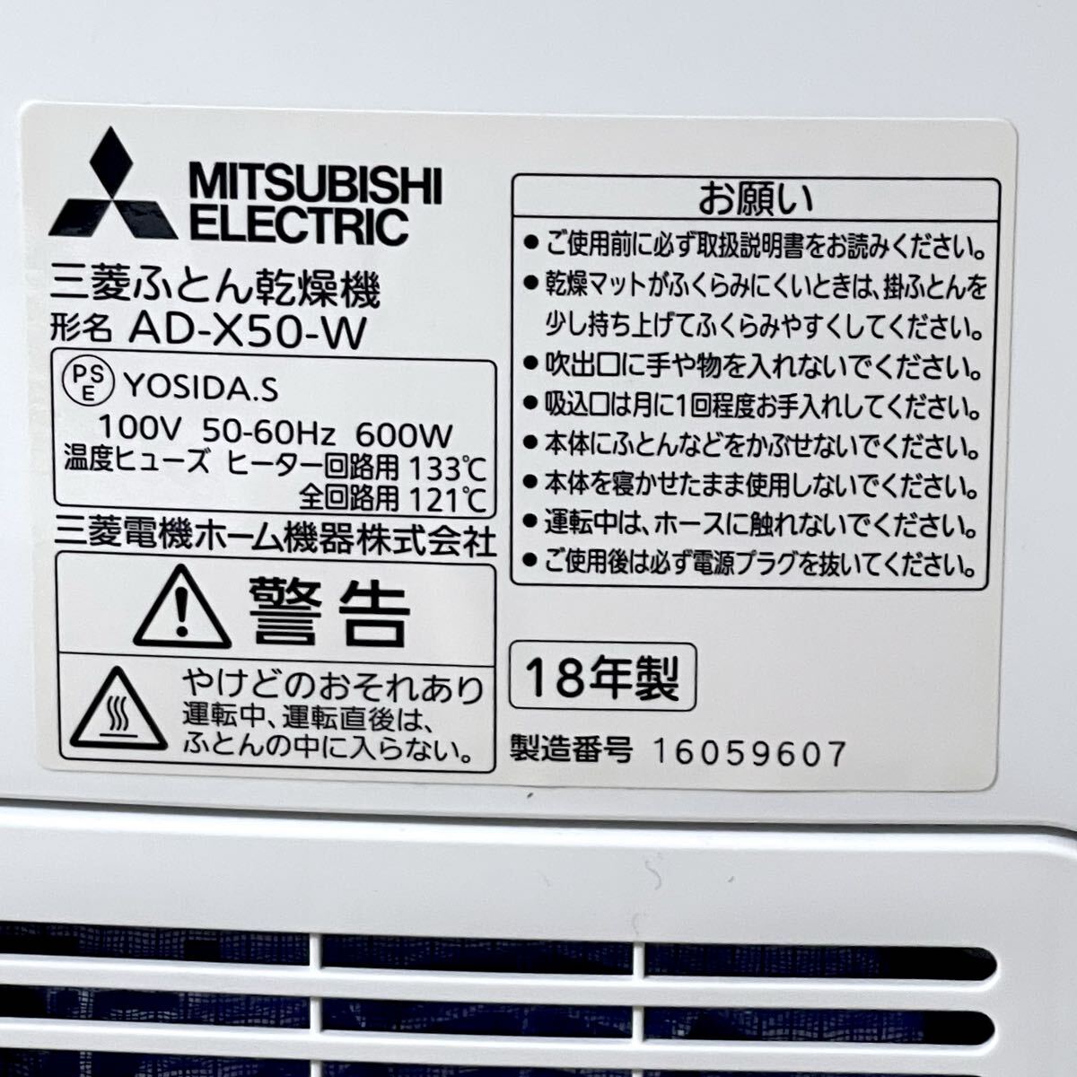 美品!動作確認済 MITSUBISHI/三菱 布団乾燥機/ふとん乾燥機 AD-X50-W