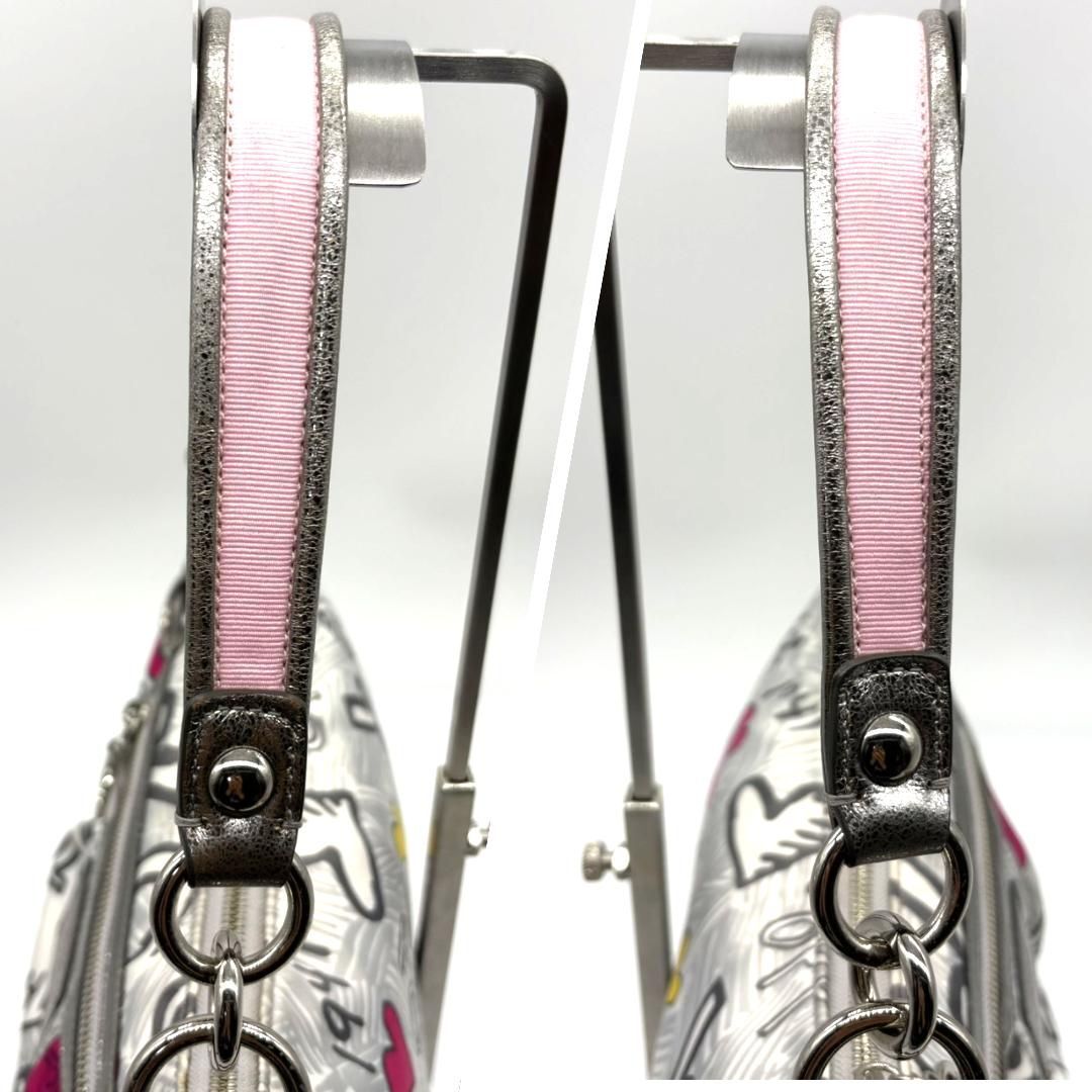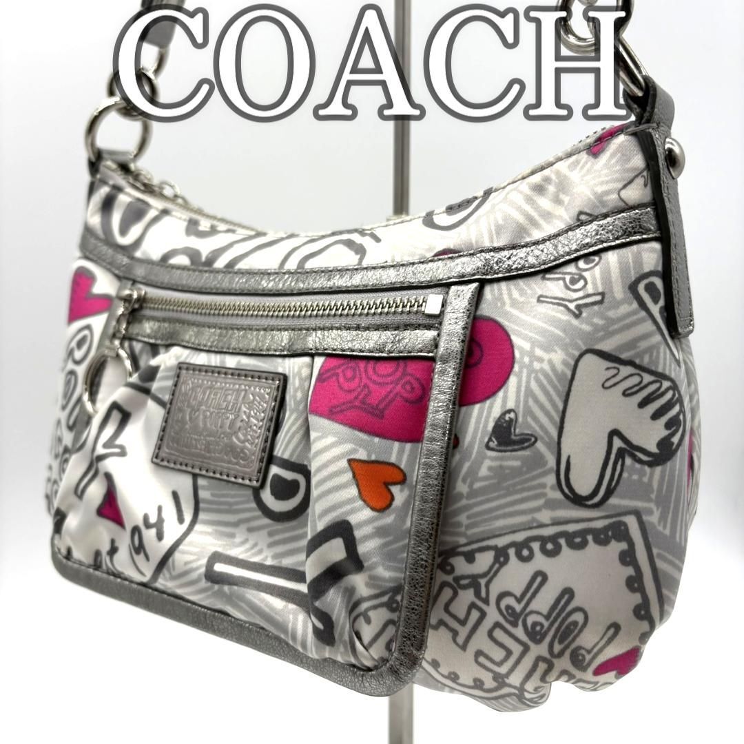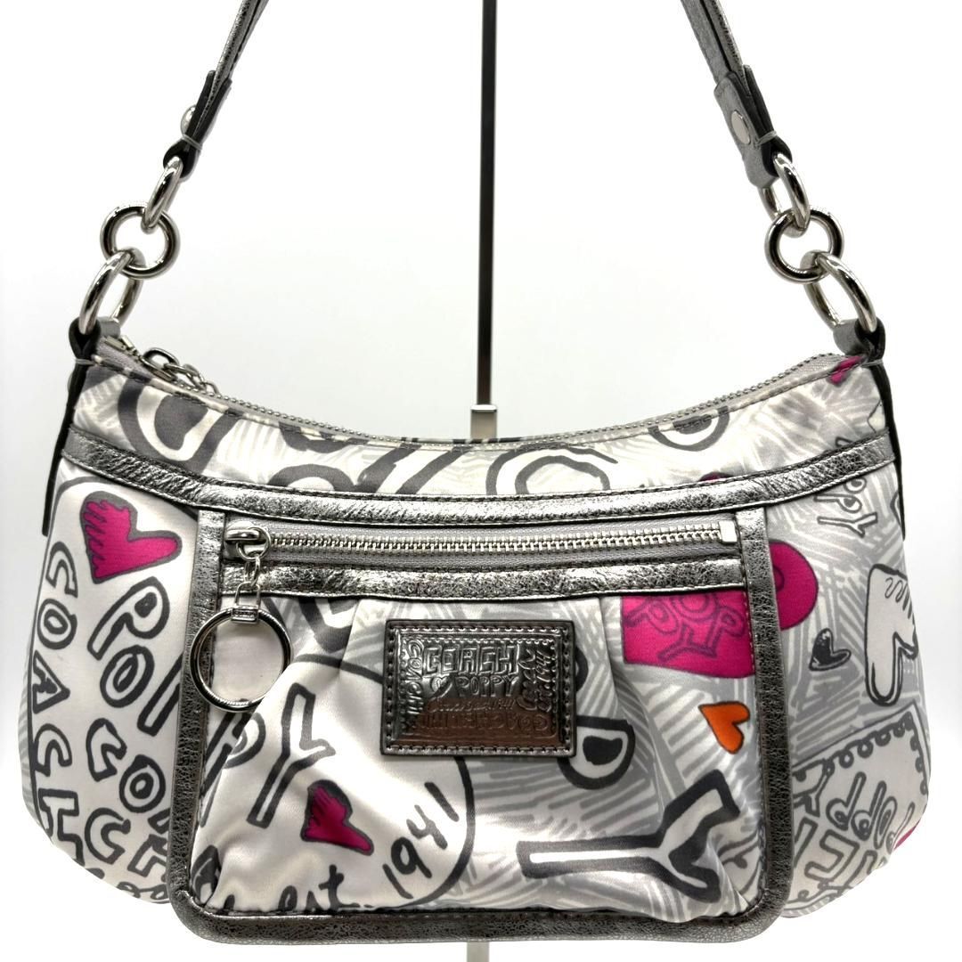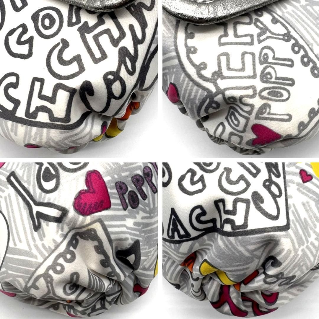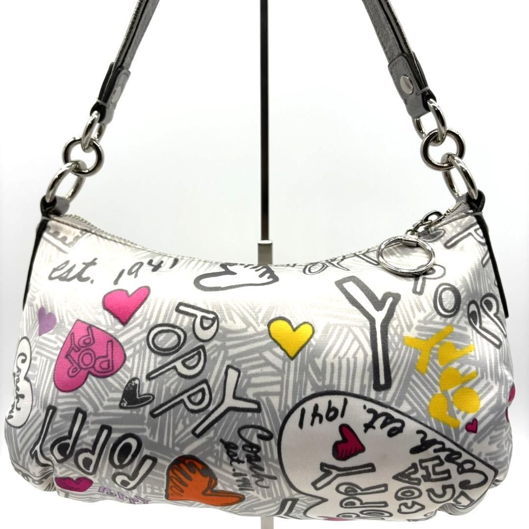COACH(コーチ)の人気ライン「POPPY」シリーズより、ハートやロゴを散りばめたグラフィティ柄のショルダーバッグです。ホワイトベースにピンクやシルバーを組み合わせた華やかなデザインで、Y2Kスタイルにもぴったり。内側はピンクのサテン生地で開けた瞬間も可愛らしい印象です。メタリックレザーの縁取りが高級感をプラス。ショルダーとハンドの2WAY仕様ですが、長いストラップは欠品しています。コンパクトながら収納力があり、デイリーにも旅行にも使いやすい万能アイテムです。