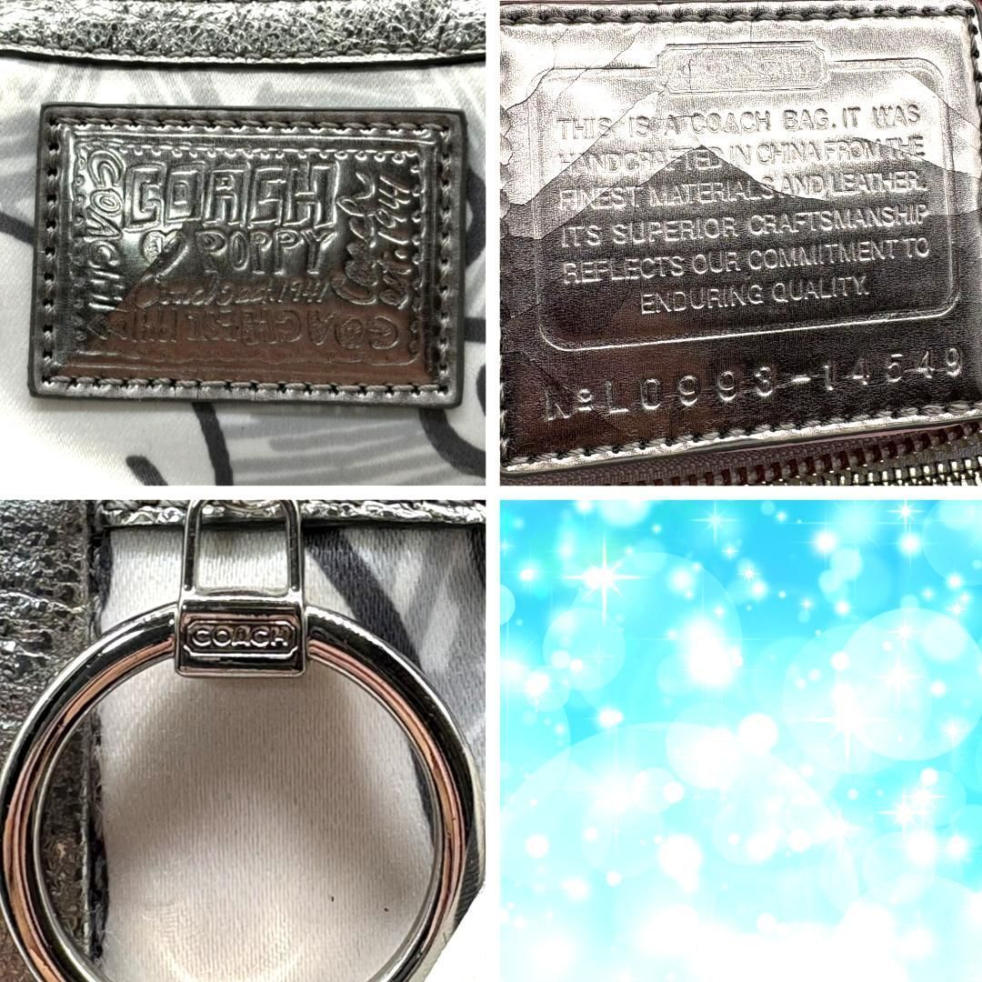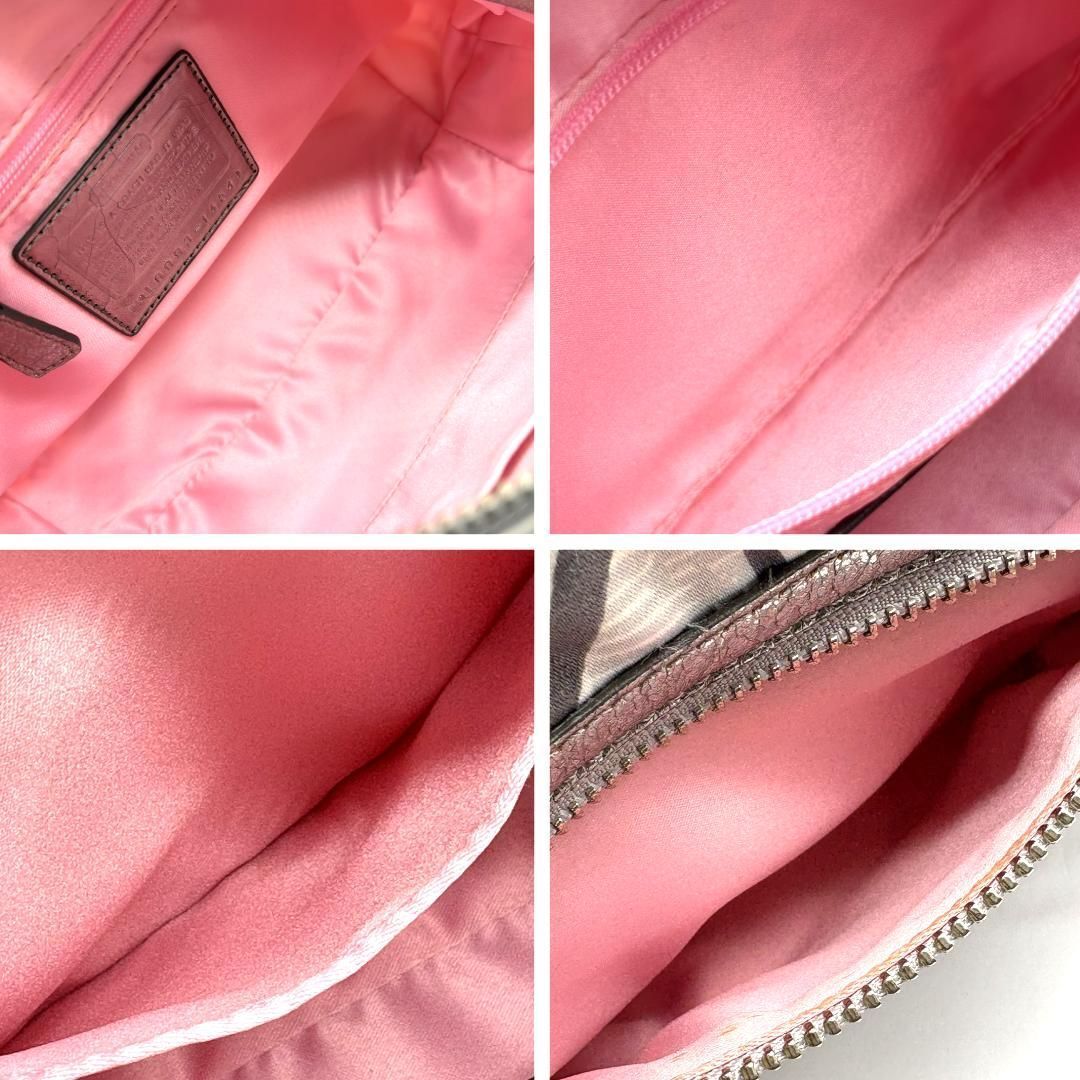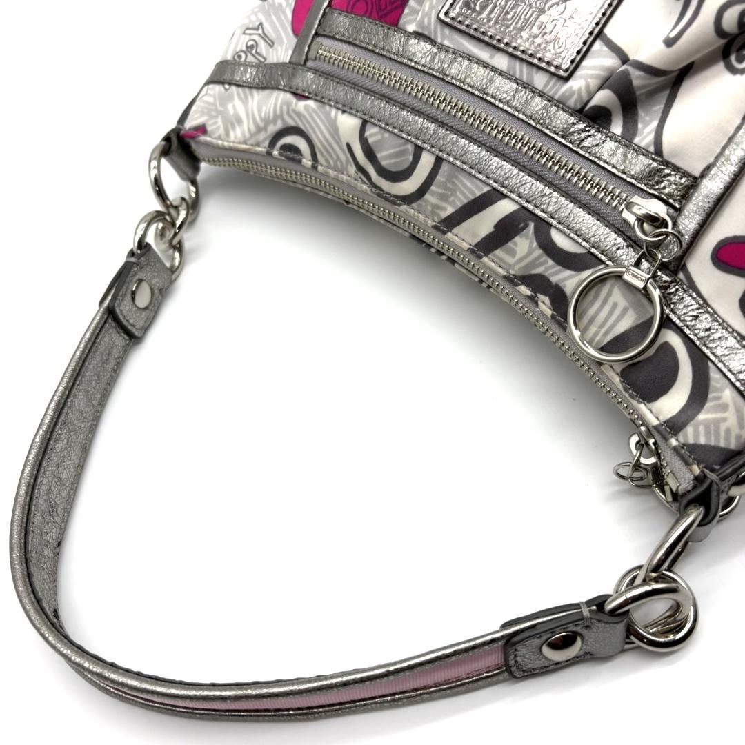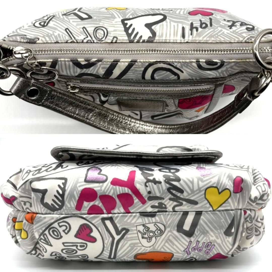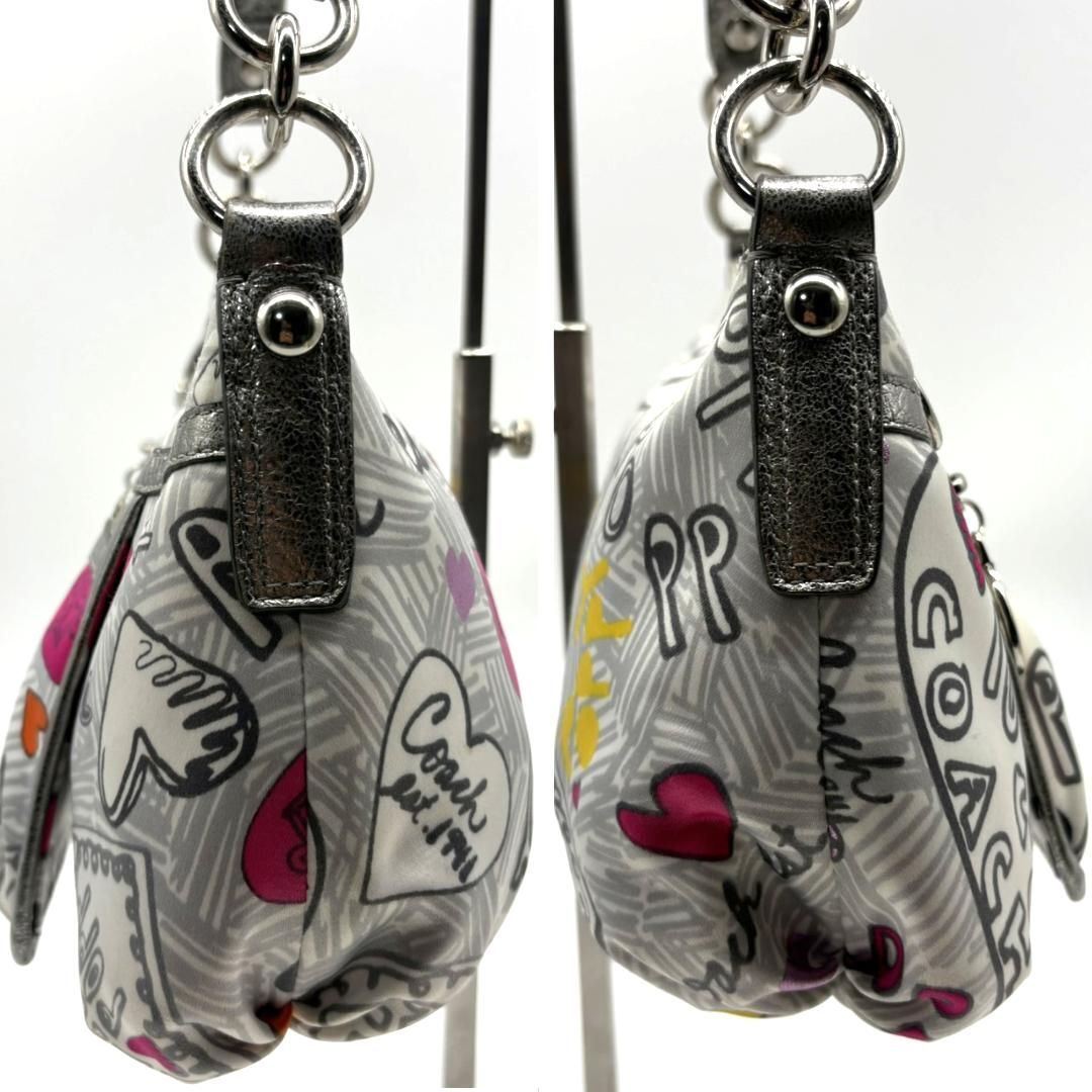 COACH(コーチ)の人気ライン「POPPY」シリーズより、ハートやロゴを散りばめたグラフィティ柄のショルダーバッグです。ホワイトベースにピンクやシルバーを組み合わせた華やかなデザインで、Y2Kスタイルにもぴったり。内側はピンクのサテン生地で開けた瞬間も可愛らしい印象です。メタリックレザーの縁取りが高級感をプラス。ショルダーとハンドの2WAY仕様ですが、長いストラップは欠品しています。コンパクトながら収納力があり、デイリーにも旅行にも使いやすい万能アイテムです。