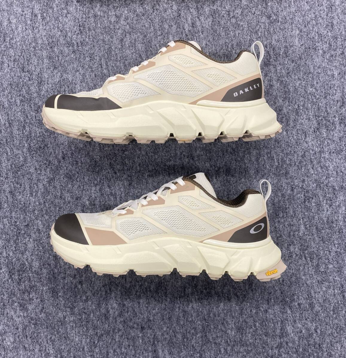 通気性に優れたメッシュ素材のアッパー。優れたグリップ力と耐久性のVibramアウトソール。補強されたつま先とヒール。サイドにELLIPSEロゴ、シュータンにOAKLEYロゴ。