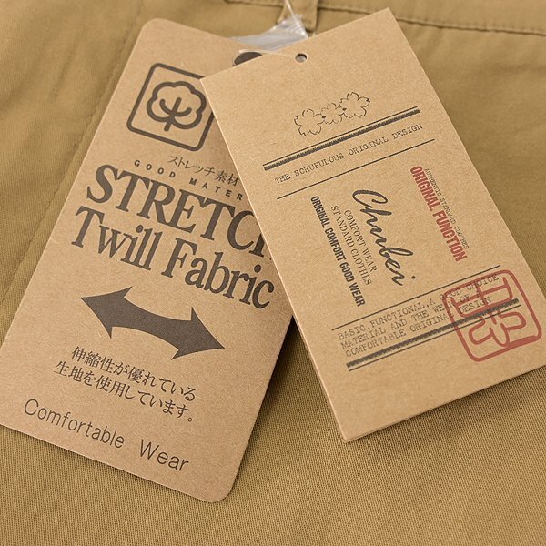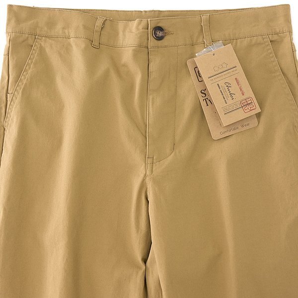| 新品 未使用 紙タグあり Lサイズ(画像は別サイズで撮影) ※商品に記載されたサイズ・寸法です※ ウエスト実寸86cm(内回り1周) 股上28.5cm 股下73cm 裾幅20cm 腿幅30.5cm(股下10cm部分) ※洗い加工の性質により多少誤差が生じることがあります※ 本体:綿97% ポリウレタン3% 別布:ポリエステル65% 綿35% ベージュ |