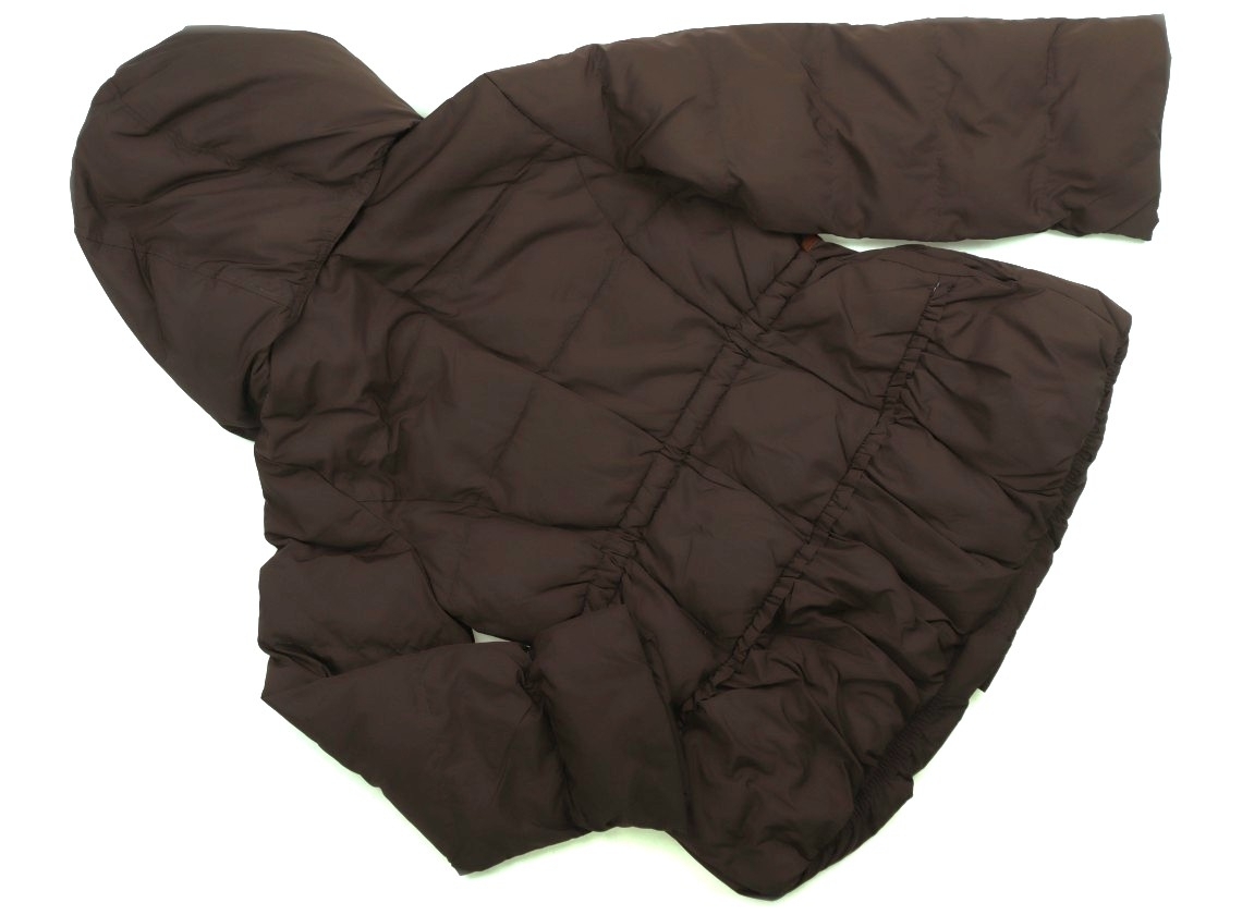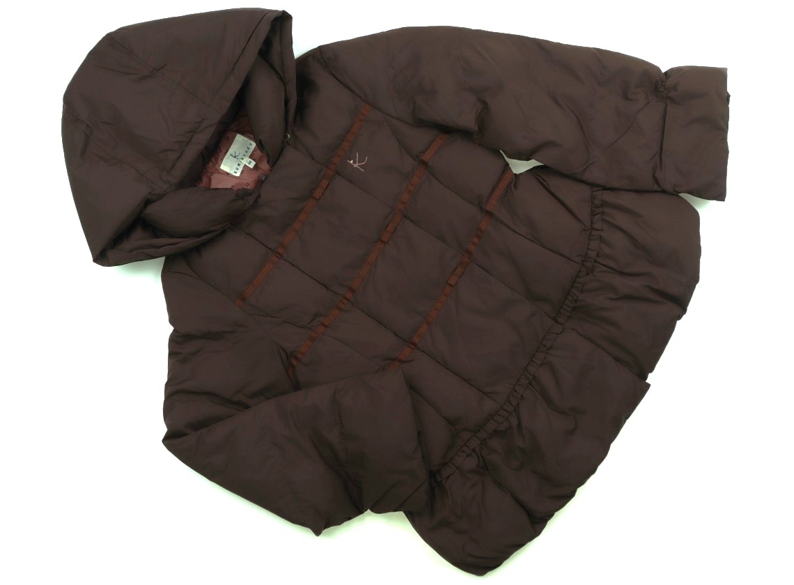 ポリエステル素材。中綿入り。フードの取り外しが可能です。ファスナー・スナップボタン開き。やや中綿の寄りが見られます。
