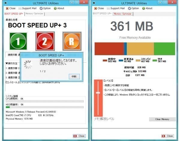 ■ BOOT SPEED UP+ 3 ■ 操作はかんたん、ボタンを押すだけです。 機能ボタンを押すだけで、自動的に処理します。 1.速度改善 通常モード 2.速度改善 念入りモード 3.速度改善 リセットモード 機能の説明 1.速度改善 通常モード 速度改善情報の組み直しを実行 2.速度改善 念入りモード 念入り・完璧に速度改善する場合にご使用下さい。 3.速度改善 リセットモード 速度改善情報の情報収集を行います ----------------------------------------------------------------------------------------------- ■ Memory Optimizer+ ■ 操作はかんたん、ボタンを押すだけです。 メモリ解放レベルは4段階、お好みを選びボタンを押すだけで自動的に処理します。 |