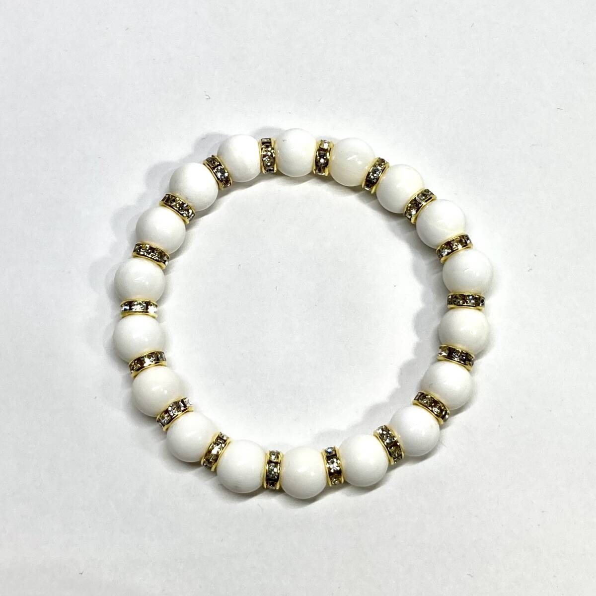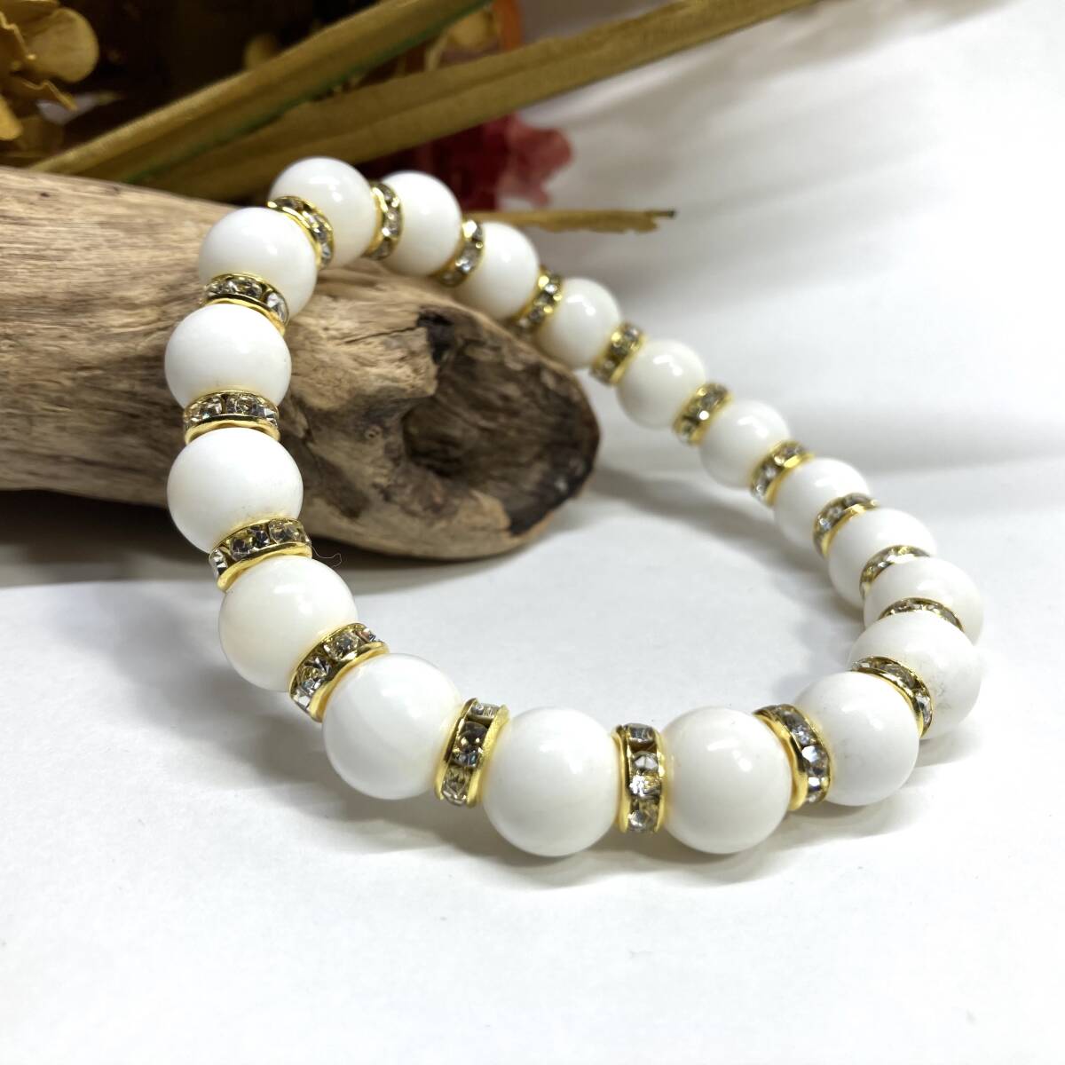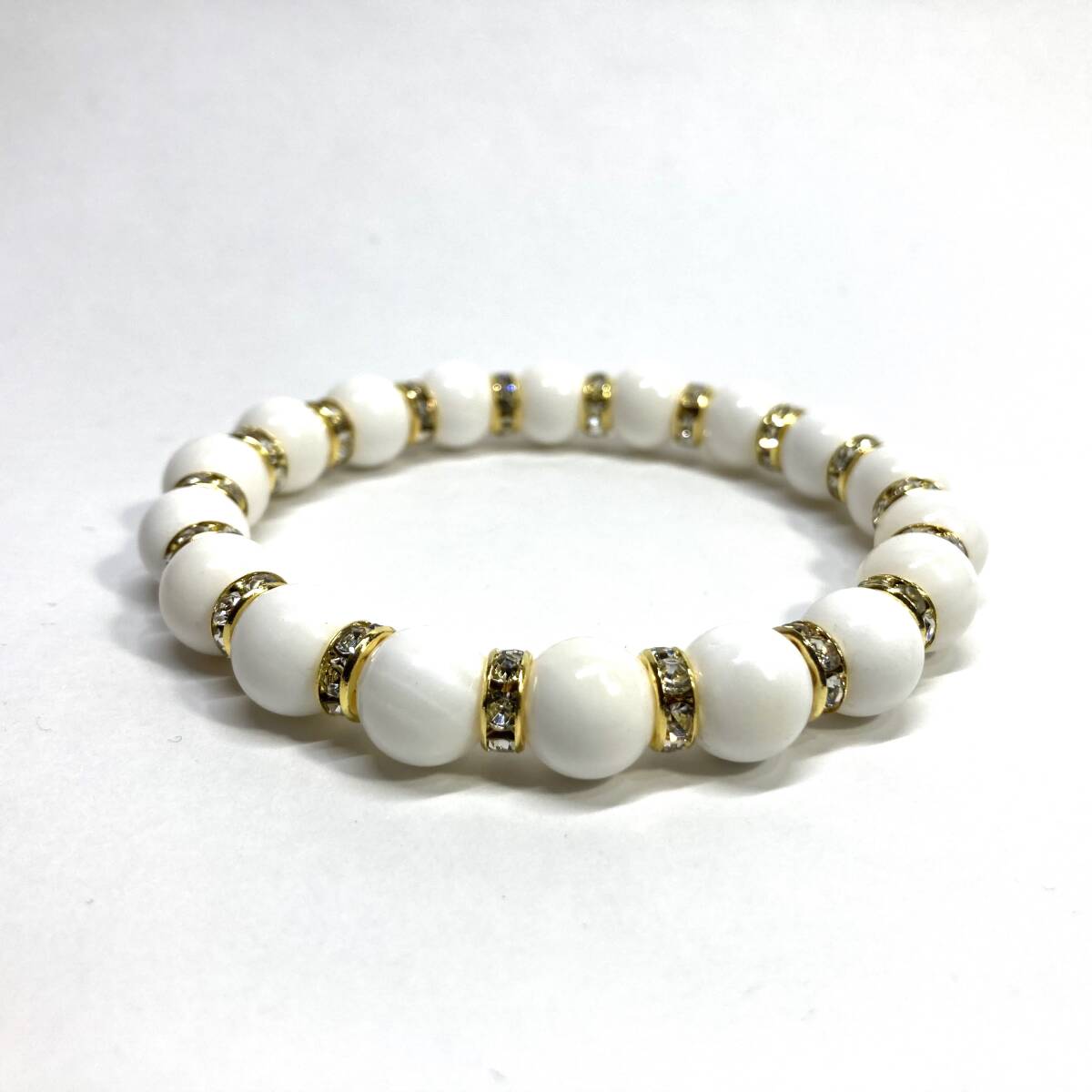 こちらは、10mm玉のホワイトオニキスを使用したパワーストーンブレスレットです。間にはロンデルを挟み高級感あるブレスレットに仕上げています。石大きさは腕にも馴染みやすいように10mm玉を使用して、サイズは内周約18cmです。(サイズ調節も無料で承っています。サイズ変更の場合は落札後、取引ナビにてご一報くださいませ。) 数に限りがございますので気になる方はお早めにどうぞ。