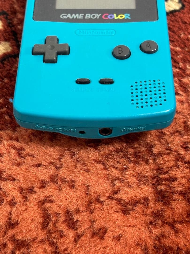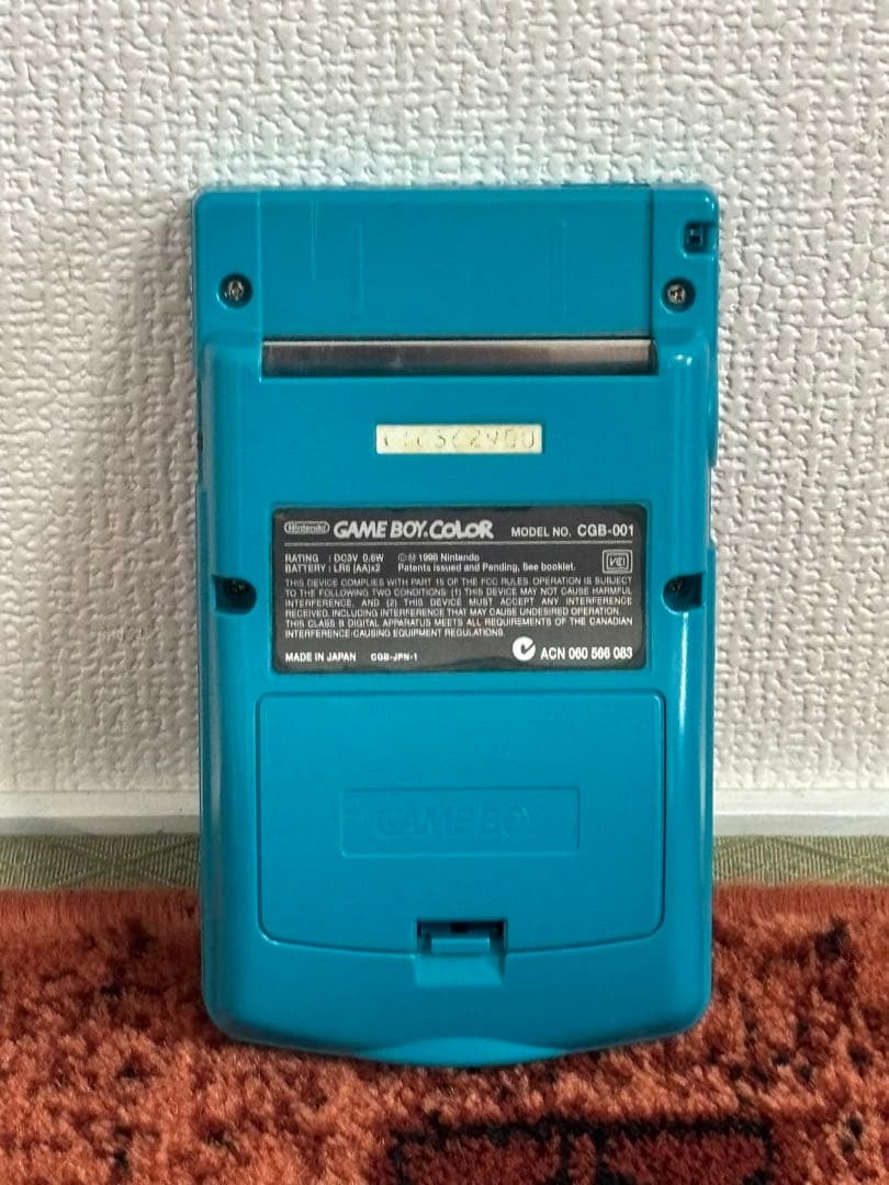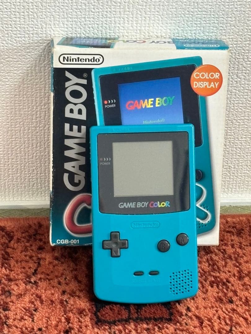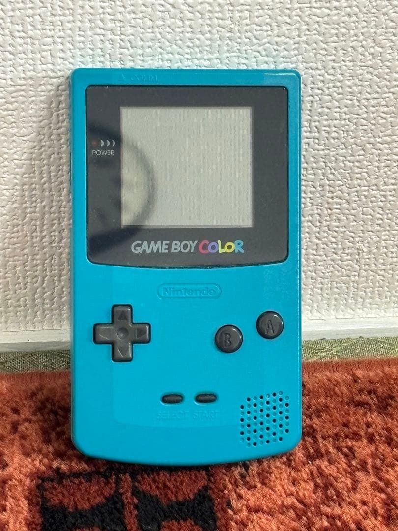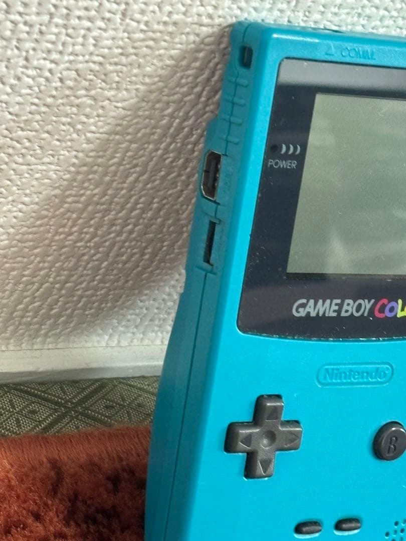 青色のGAME BOY COLOR、カラー表示対応、リンクケーブルポート付き。