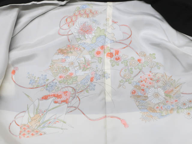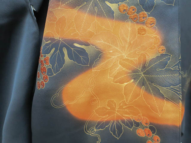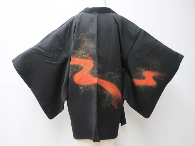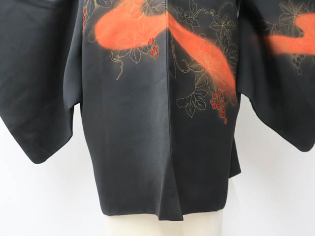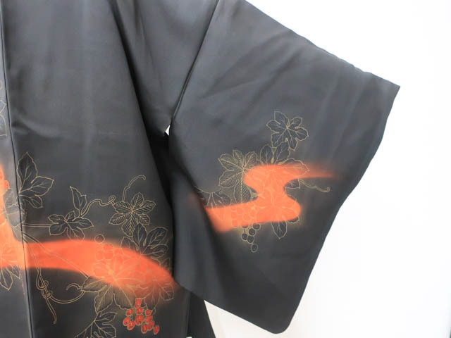 リサイクル商品のため、シワがございますがご着用いただけると存じます。 地色は黒です。 1枚目の画像が近いお色かと思われます。 素材は正絹です。 |