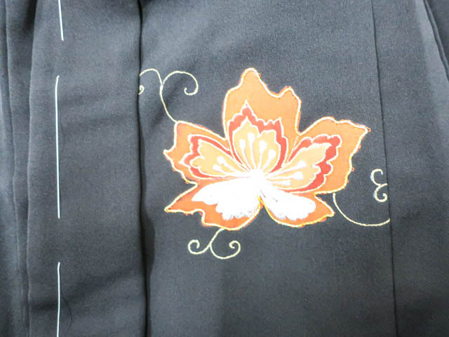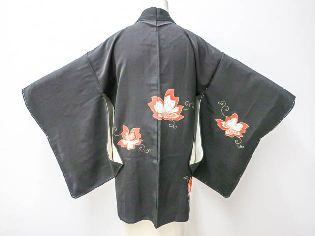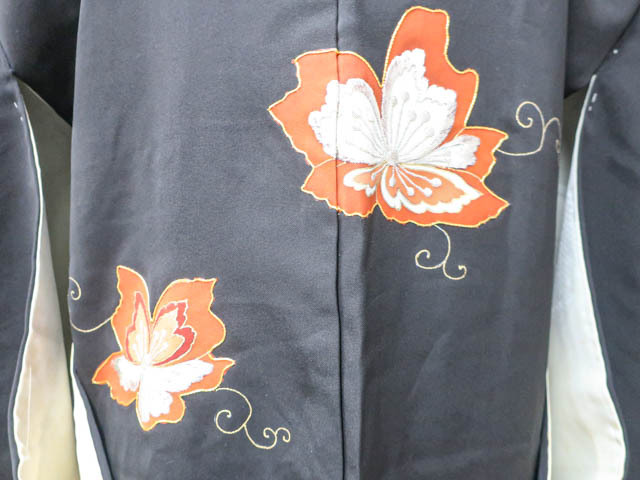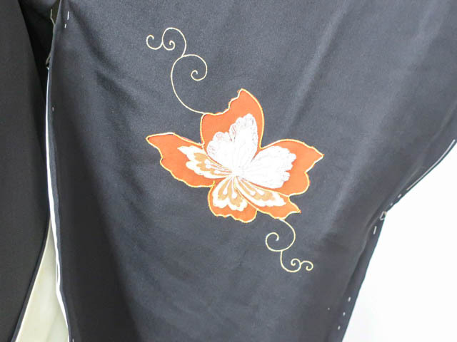 リサイクル商品のため、羽裏にシミ、刺繍に糸飛び出しがございます。 また、右後袖、左前袖に薄いシミがございますが着用可能なお品です。 地色は、黒色です。 1枚目の画像が近いお色かと思われます。 素材は正絹です。 |