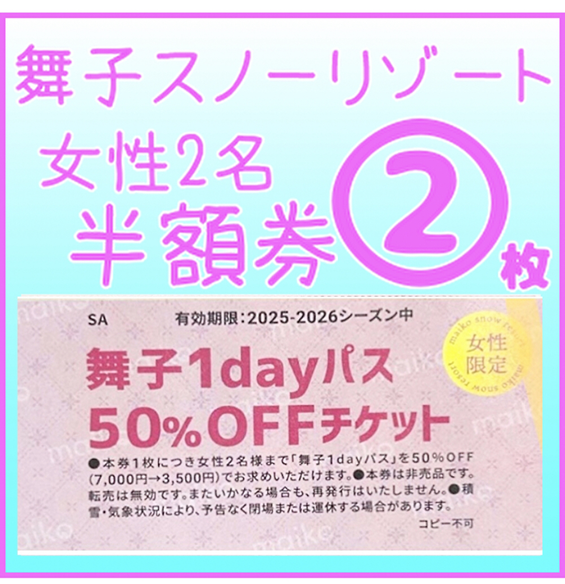 本券1枚で女性2名様まで大人リフト1日券半額
