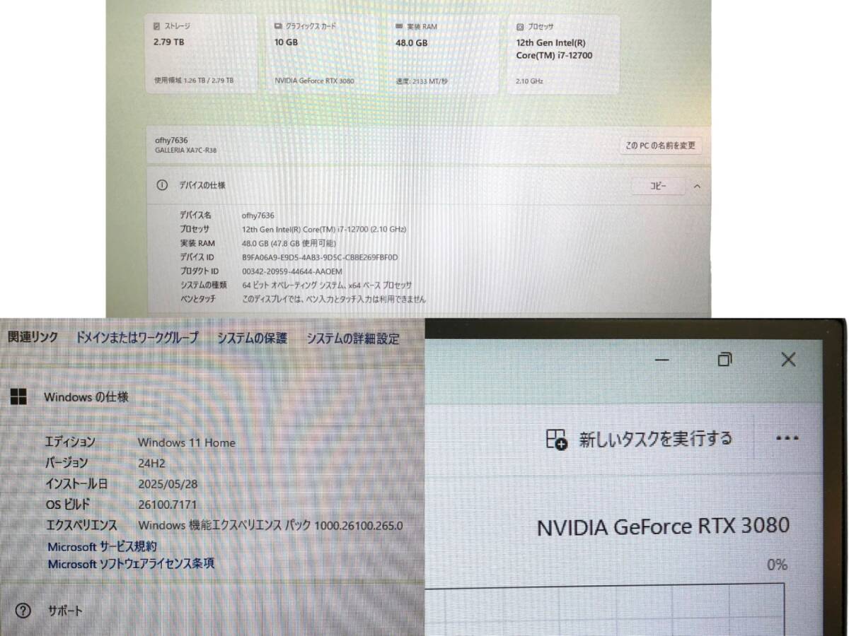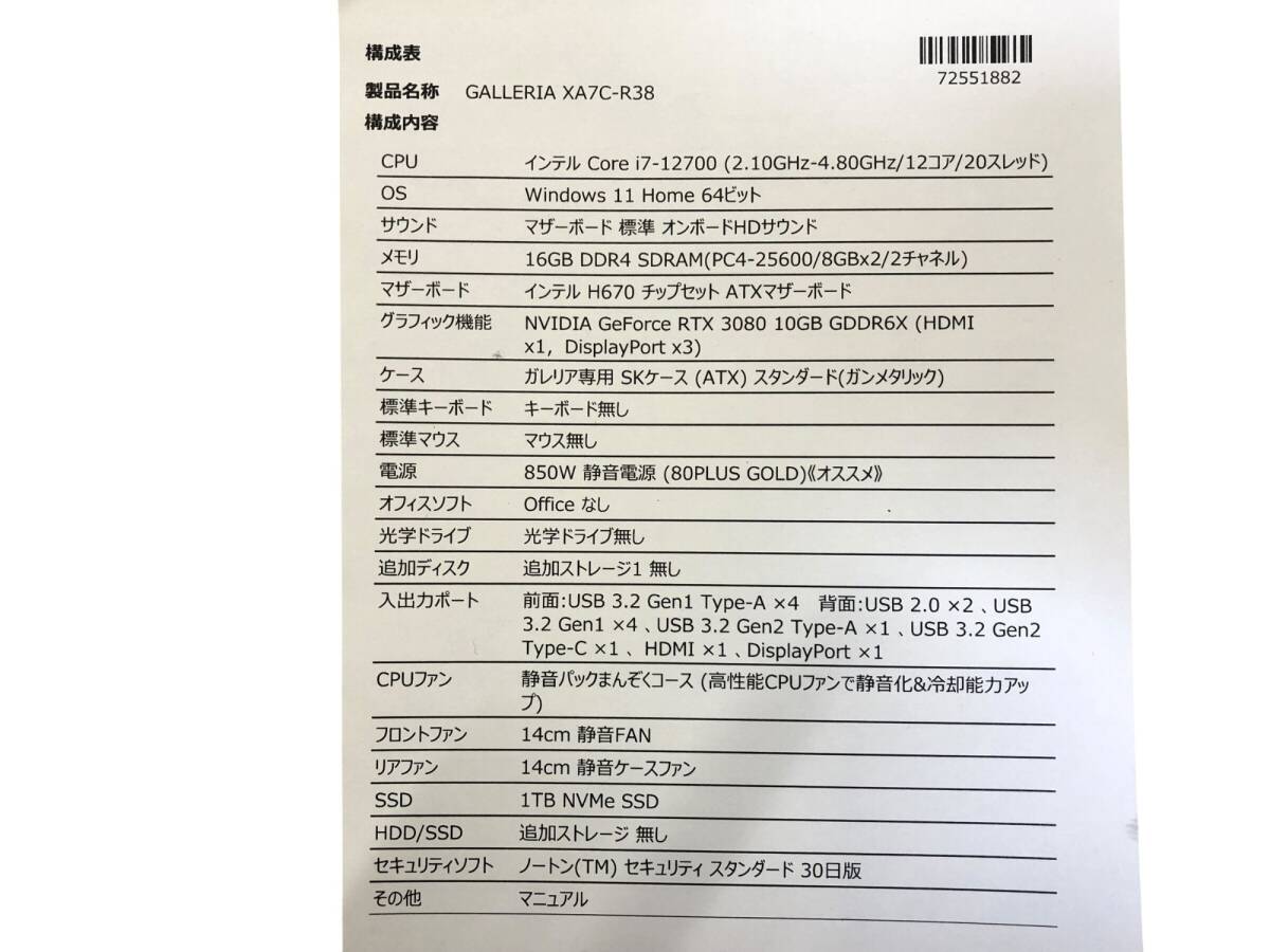 | 【商品名】 ■◎GALLERIA XA7C-R38 デスクトップPC i7-12700 RTX3080 メモリ48GB ストレージ2.7TB Windows112121451 |