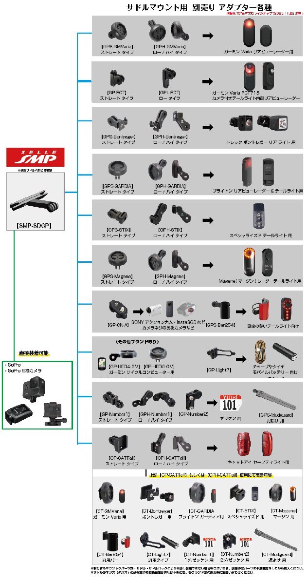 GoPro HEROシリーズのカメラ または ゴープロインターフェイスのある互換性があるカメラや、GPの型番で始まるセーフティライトアダプター・テール系アダプター(泥除け/ゼッケンなど)・カメラアダプター・ライトアダプター・サイクルコンピューターアダプターなどが取付可能