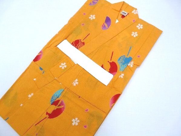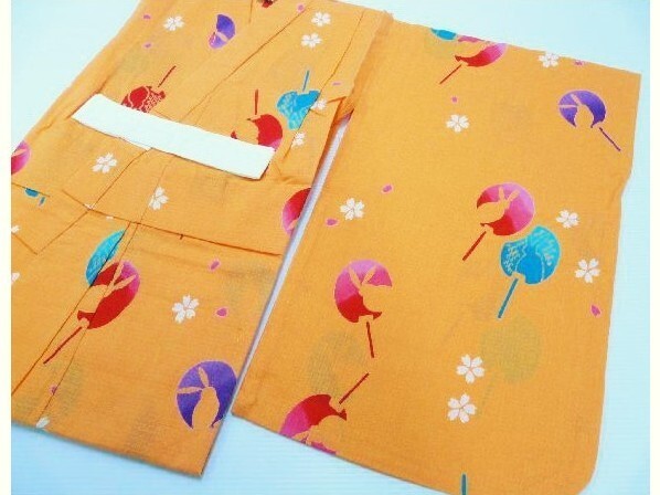 166 新品 女児 子供浴衣 オレンジに内輪 110cm