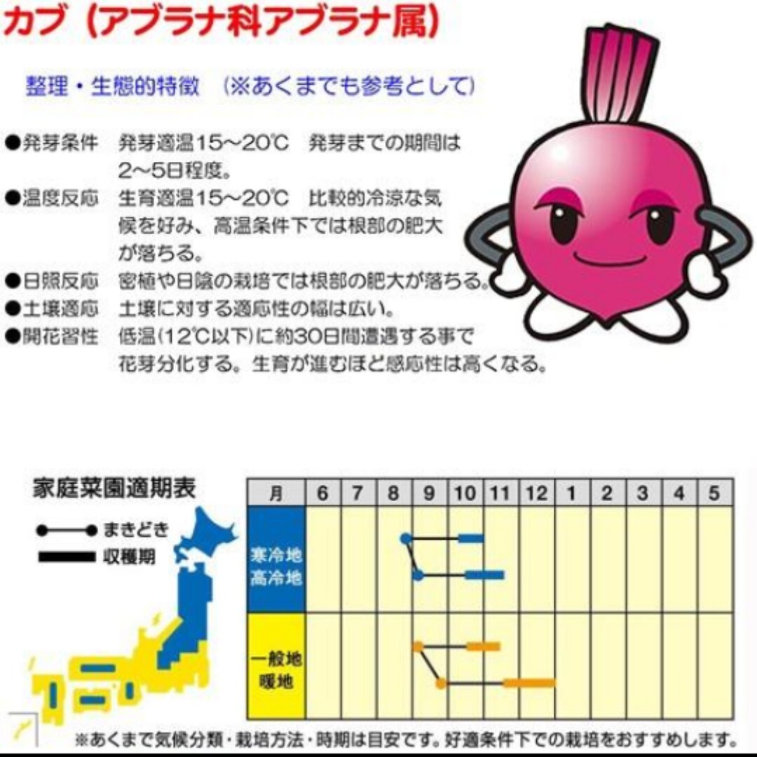 種まき後55日くらいで8cmくらいの中蕪となり、12cmくらいまで大きく出来ます。