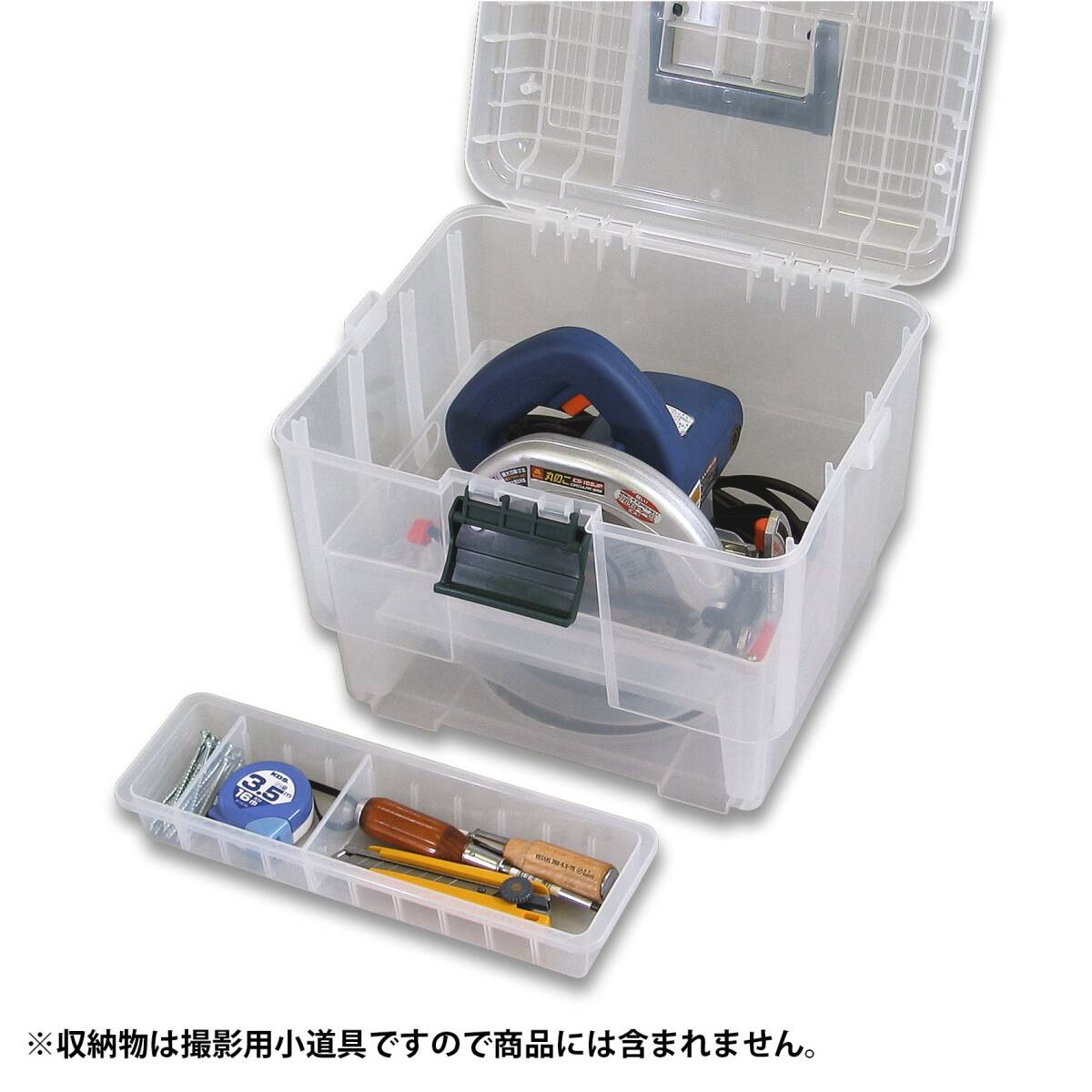 ● ナチュラルカラーなので外から内容物が確認できます。 ● 2種類のトレーが入っており、作業に必要な工具や関連する用具などを整理して収納でき、移動にも便利です。 ● 本体下部には替鋸刃を2枚セットできます。