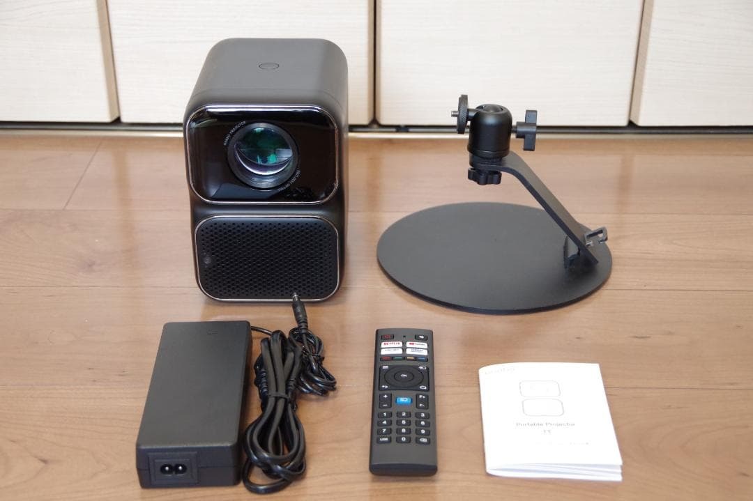 Netflix対応のWANBOプロジェクター、リモコンと電源アダプター付き、コンパクトなデザイン。