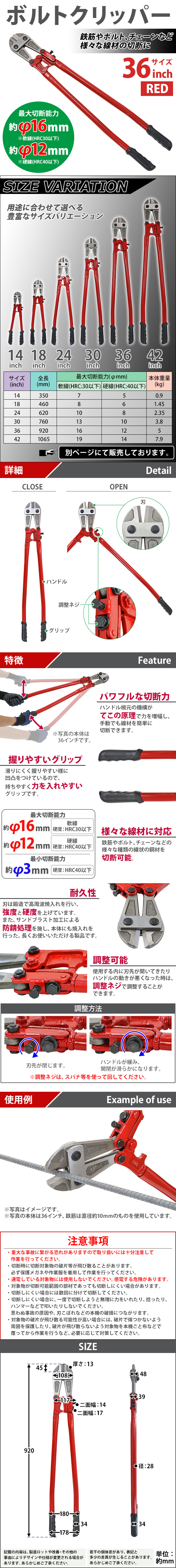 | 商品名 | 送料無料 ボルトクリッパー 36インチ 36" 全長約920mm 最大切断能力約φ16mm(軟線) 約φ12mm(硬線) ボルトカッター ワイヤカッター ワイヤーカッター チェーンカッター 調整ネジ付き 切断 手動 線材 鉄筋 ボルト チェーン 工具 切断 工具 業務用 現場 bclipper36inch |