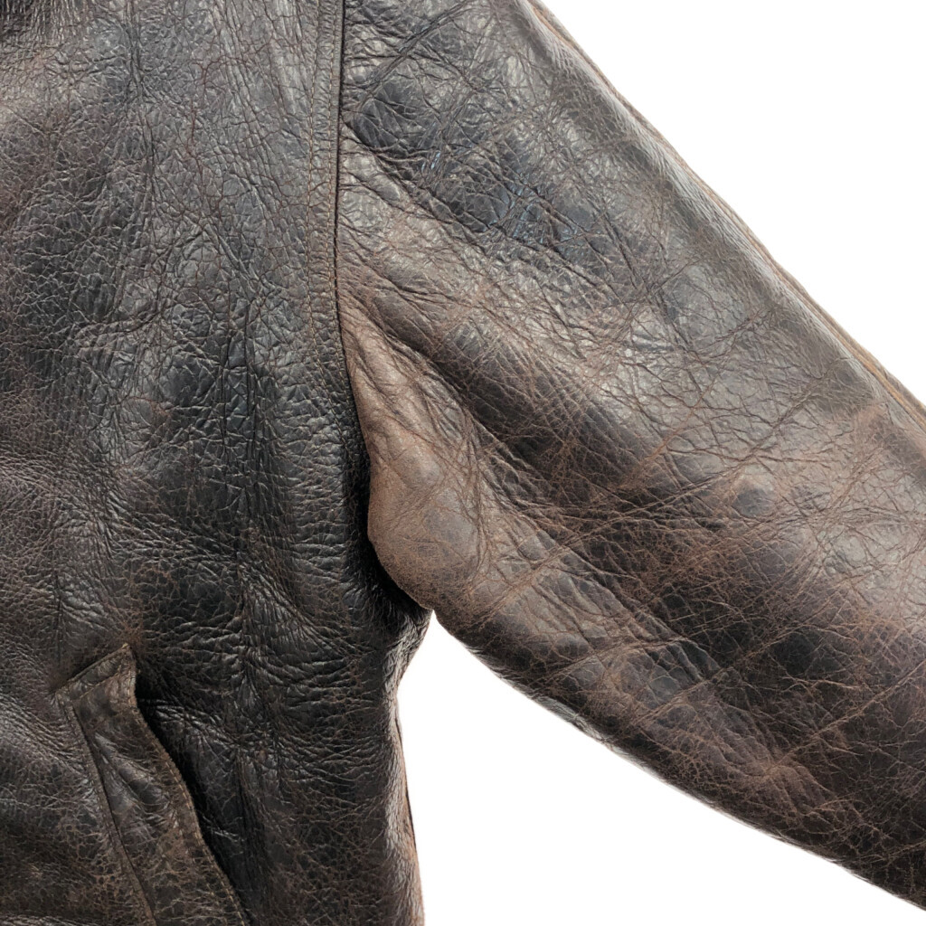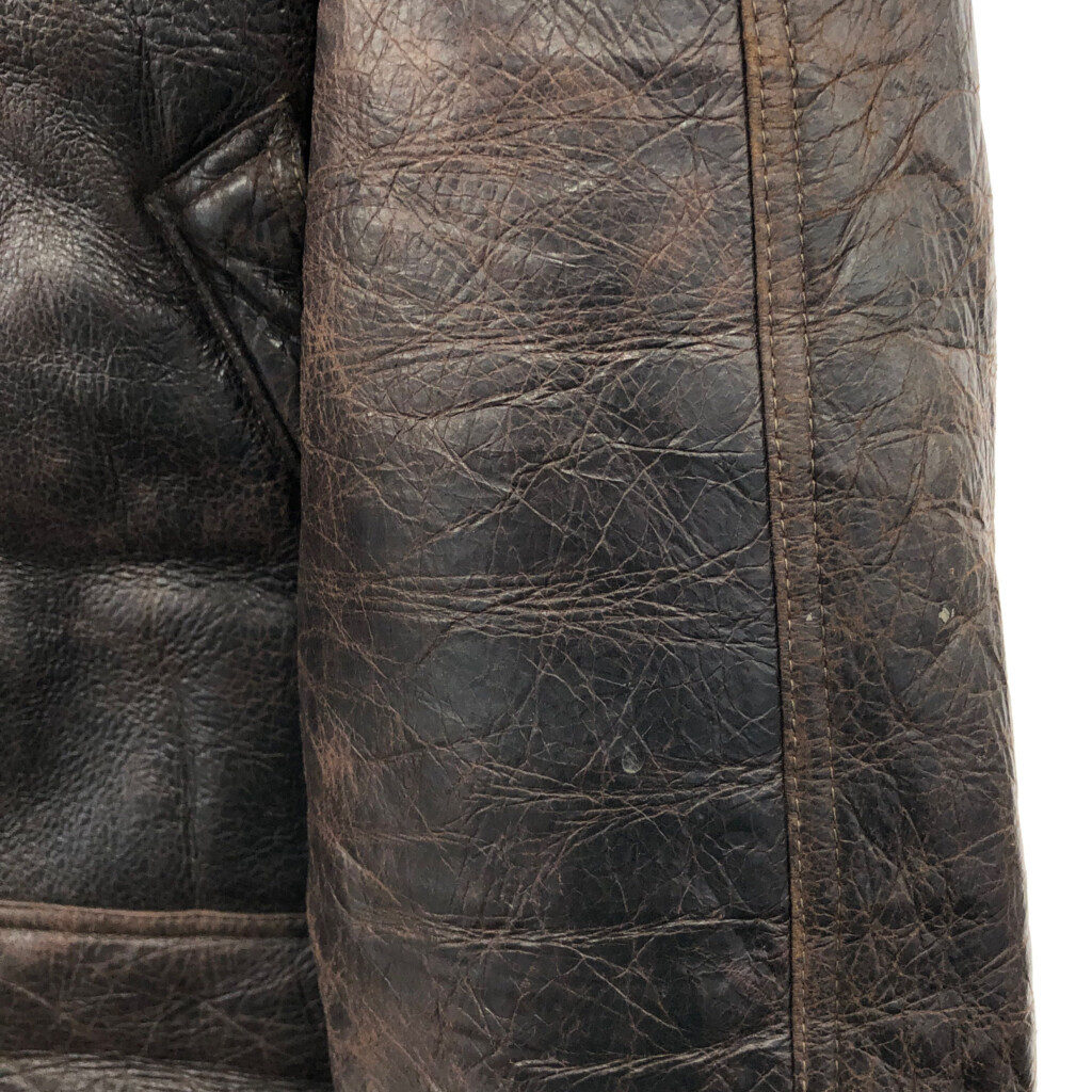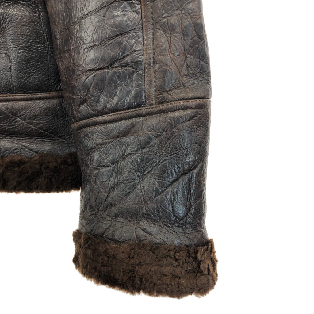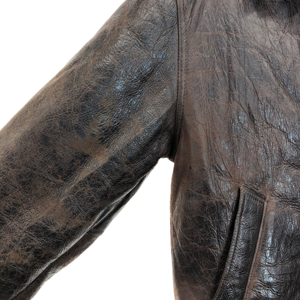 | 【商品管理番号】 R8296 【サイズ】 M相当 【実寸サイズ】 肩幅:約52cm 着丈:約67cm 身幅:約59cm 袖丈:約61cm 【主な素材】 表地 : レザー 【色】 ブラウン 【仕様】 ミリタリー B-3 フライトジャケット 【状態】 汚れ:袖、袖先 キズ:脇 | |||
