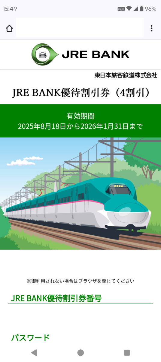 JRE BANK優待割引券番号とパスワードを取引ナビでお送りします。