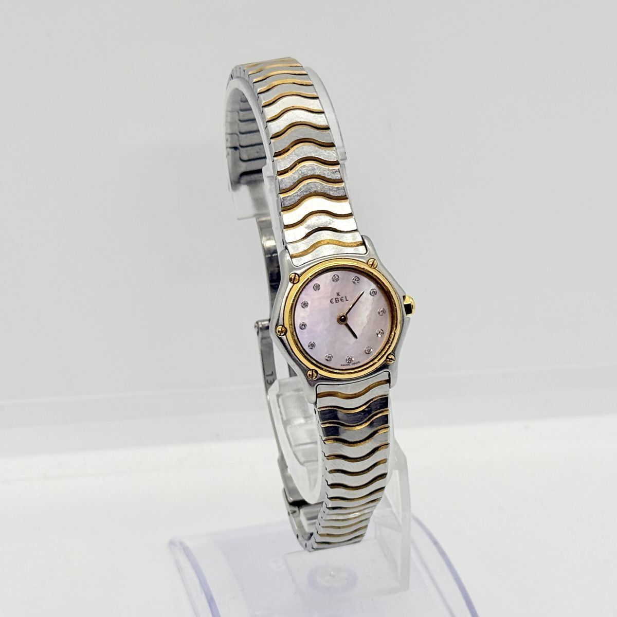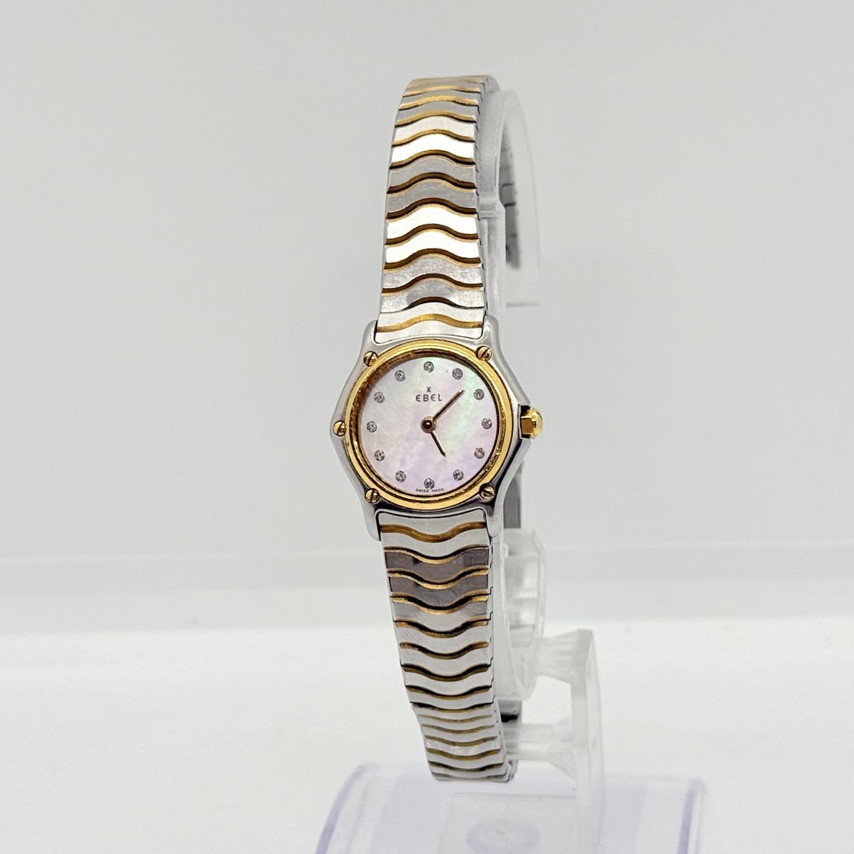 K8594 EBEL エベル クラシックウェーブ E1157111 QZ クオーツ シェル文字盤 18K 750 ストーン レディース 稼働品 腕時計