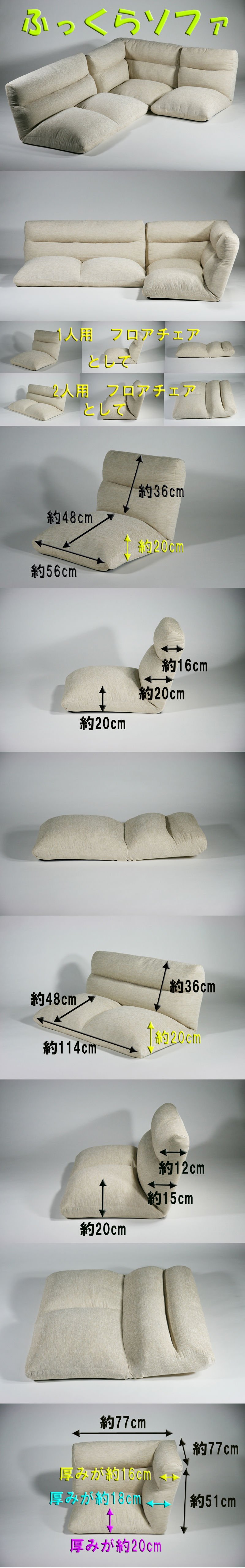 | 商品紹介 | ◆厚みが最大20cmもあり、ふっくらした座面で、ゆったりできるリビングフロアソファです。 ◆1人掛け、2人掛けとしても使用できそれぞれ6段階の角度調節可能で、お好みに合わせて作業しやすい体勢に調節できます。 (※L字のフロアソファは、リクライニングできません。) ◆もちろん、フロアベッドとしてもご利用できます。 |
